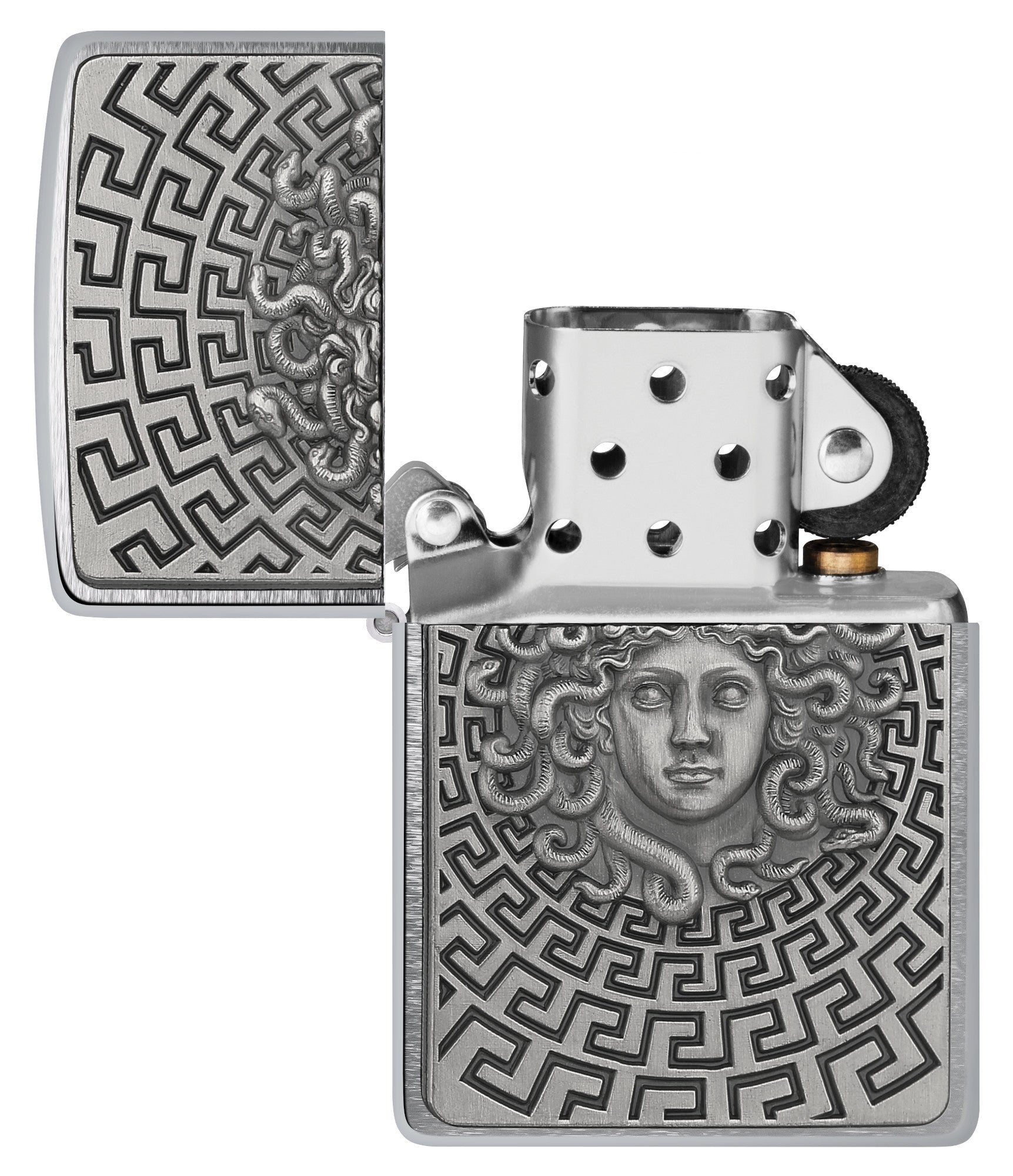 Das Antlitz der Medusa, das bekanntermaßen selbst die mächtigsten unter den Sterblichen in Stein verwandelt, soll auch ein Symbol des Schutzes sein und Böses abwehren. Dieses klassische Feuerzeug in gebürstetem Chrom zeigt das Haupt der Medusa vor einem hypnotisierenden geometrischen Hintergrund auf einem aufwendig gravierten Metallemblem.