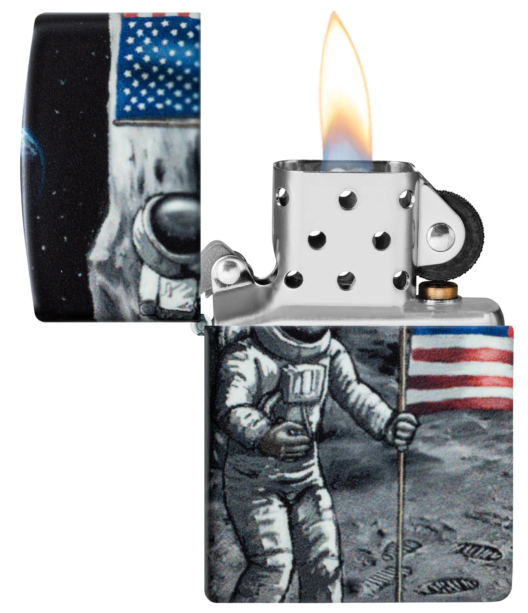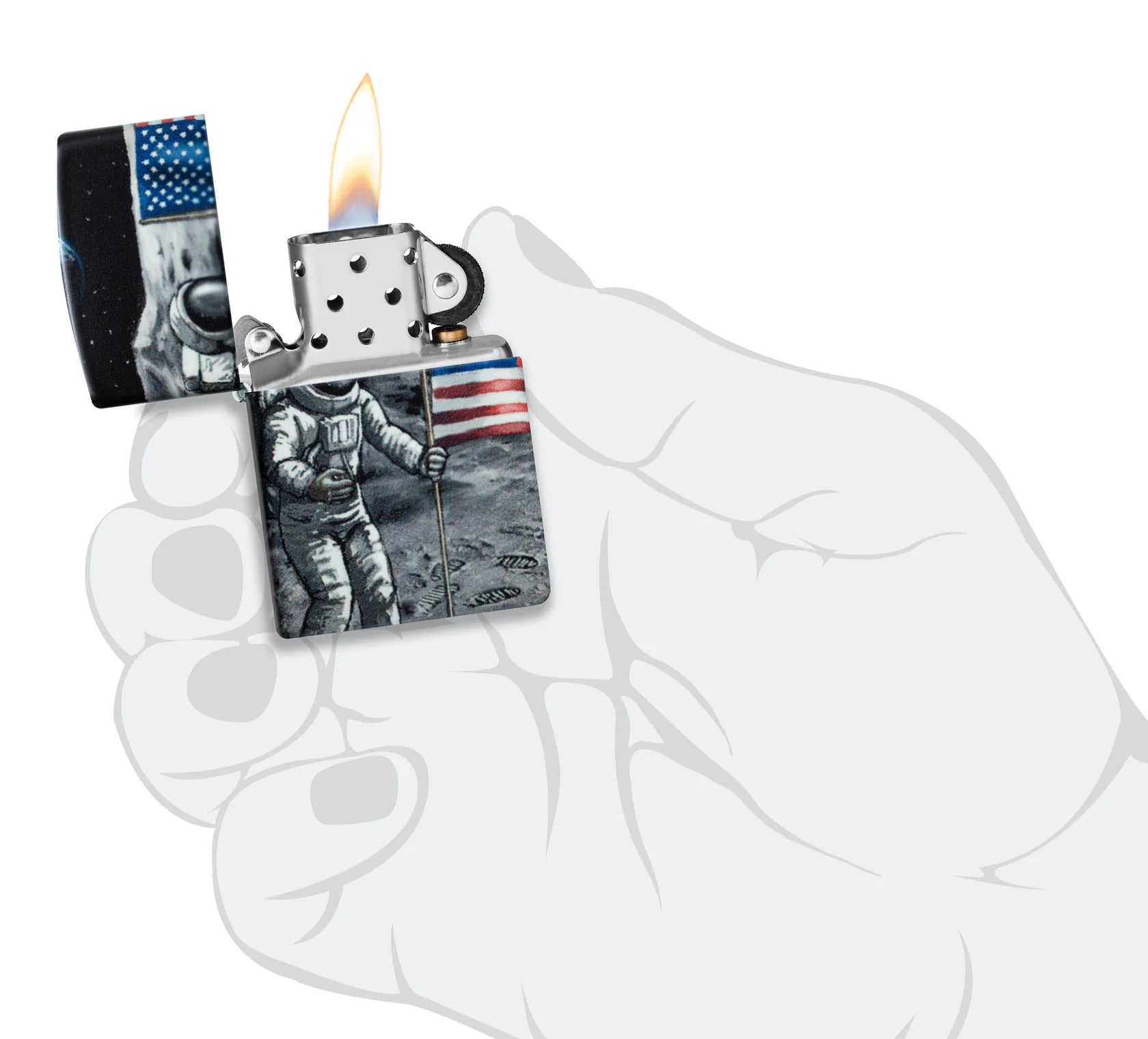 Die legendäre amerikanische Mondlandung ist auf diesem 540° Color Feuerzeug in einem leuchtenden All-Over-Design brillant festgehalten. Die Szene ist mit unserem Glow-in-the-Dark Finish für zusätzlichen Reiz behandelt.