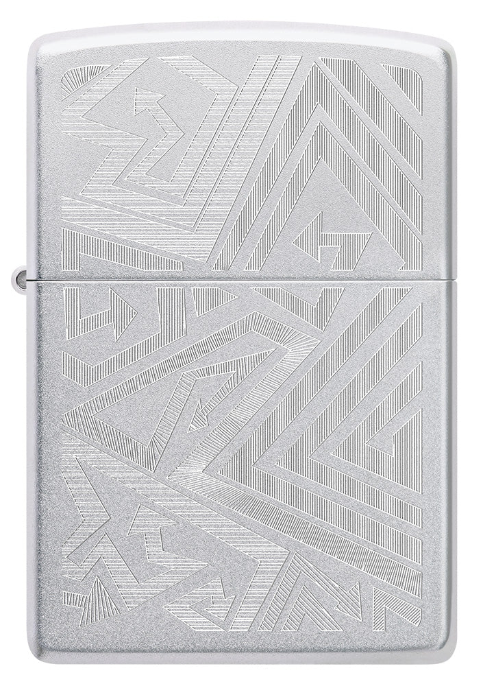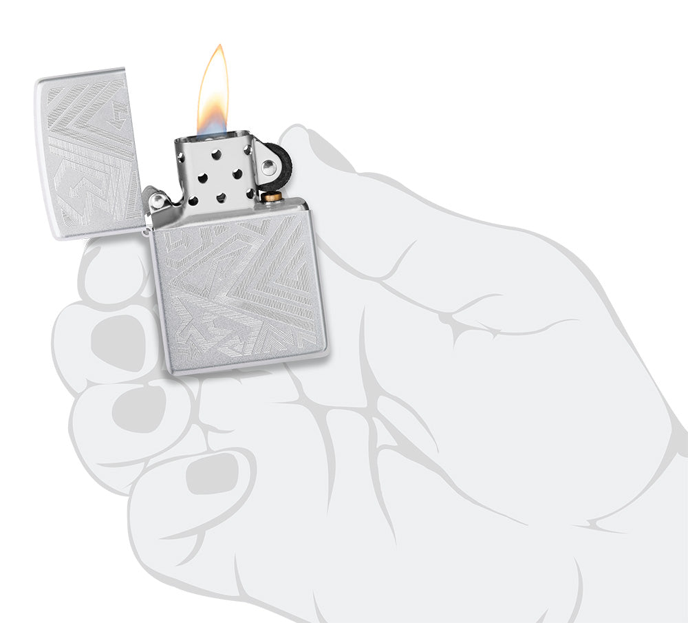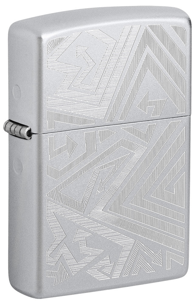 Egal, in welche Richtung Du gehst, dieses klassische Feuerzeug in Satin Chrome ist bereit, dich zu begleiten. Ein Meer von Pfeilen windet sich in einem faszinierenden Auto Engrave Design über die Oberfläche.