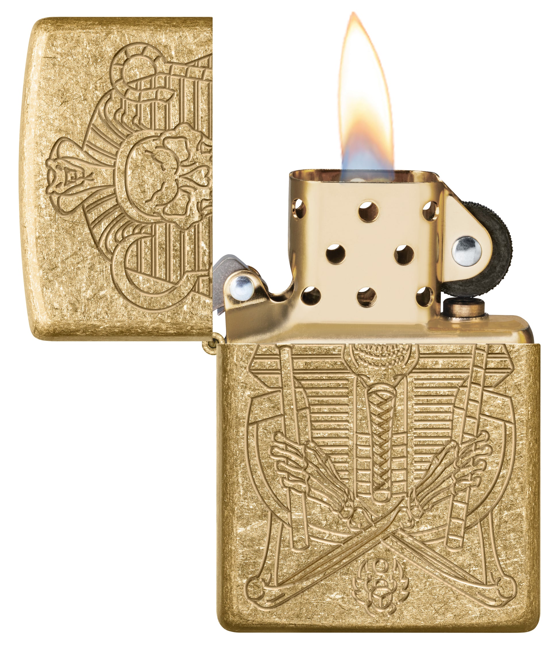 Fordern Sie mit diesem Armor® Tumbled Brass Feuerzeug einen Anteil am Schatz des Pharaos, ohne ein antikes Grab zu plündern. Das komplexe Muster ist dank unseres Deep Carve-Verfahrens bis ins kleinste Detail graviert.