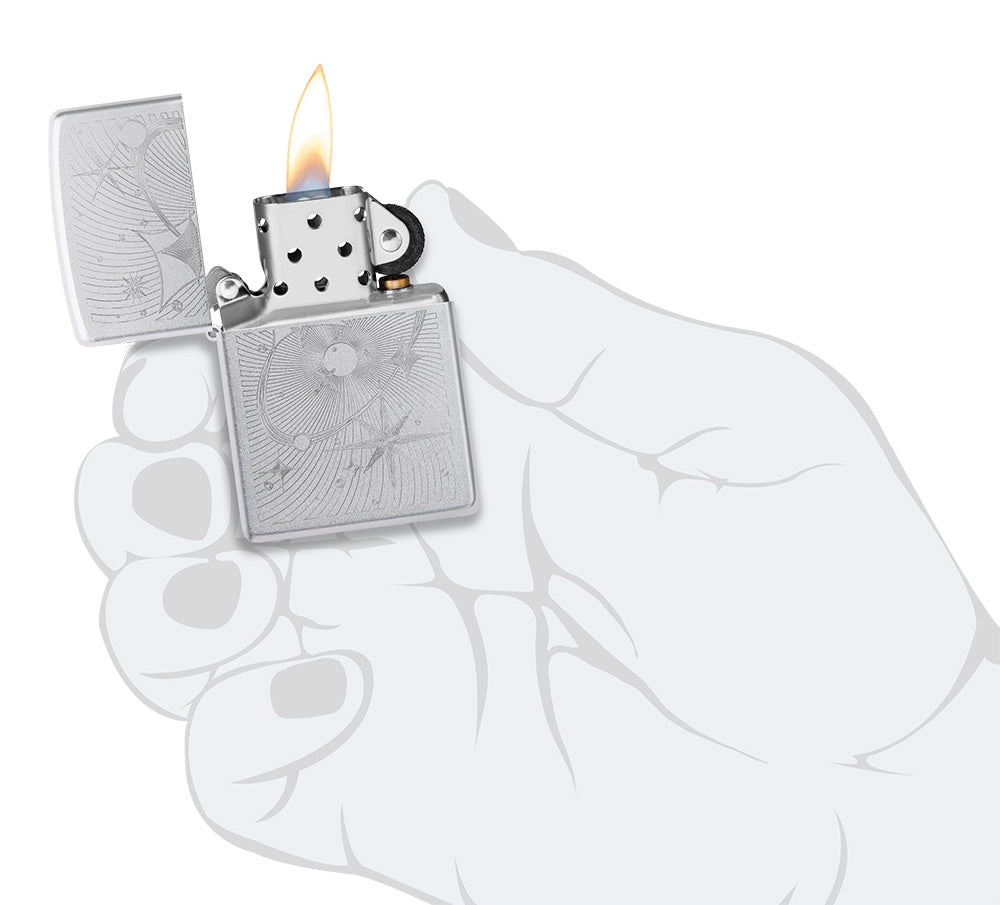 Inspiriert von Midcentury-Kunstwerken wirbelt ein kompliziertes Netz aus Sternen und Planeten in einem dezenten Auto Engrave-Design über die Oberfläche dieses klassischen Feuerzeugs in Satin Chrome.