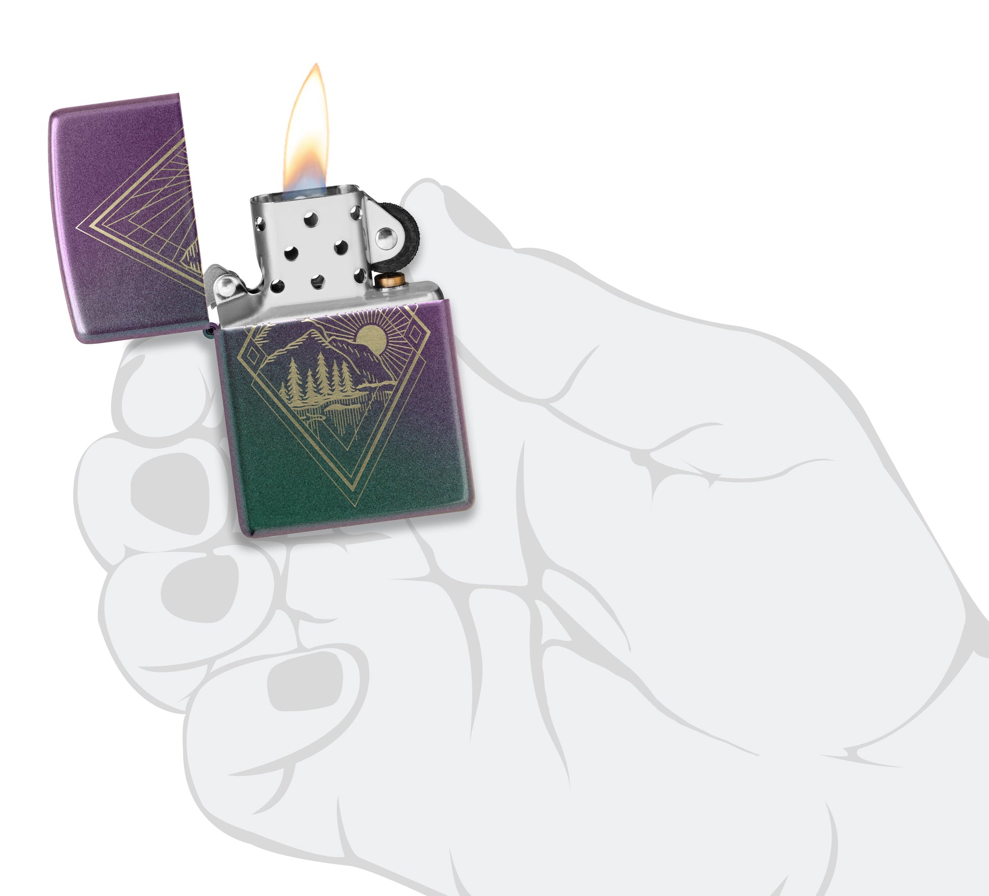 Mit diesem schillernden Feuerzeug geht es nach draußen. Das lasergravierte Design steht in luxuriösem Kontrast zum satinierten Ombré-Hintergrund.