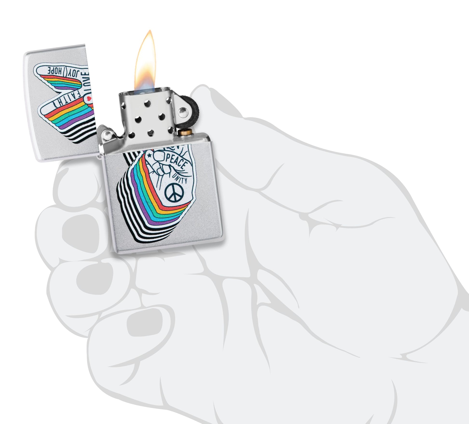 Dieses klassische Satin Chrome-Feuerzeug strahlt Frieden und Liebe aus. Das Color Image-Design zeigt ein mehrfarbiges Friedenszeichen, das mit „Glaube“, „Freude“, „Hoffnung“, „Liebe“, „Einheit“ und natürlich „Frieden“ beschriftet ist.