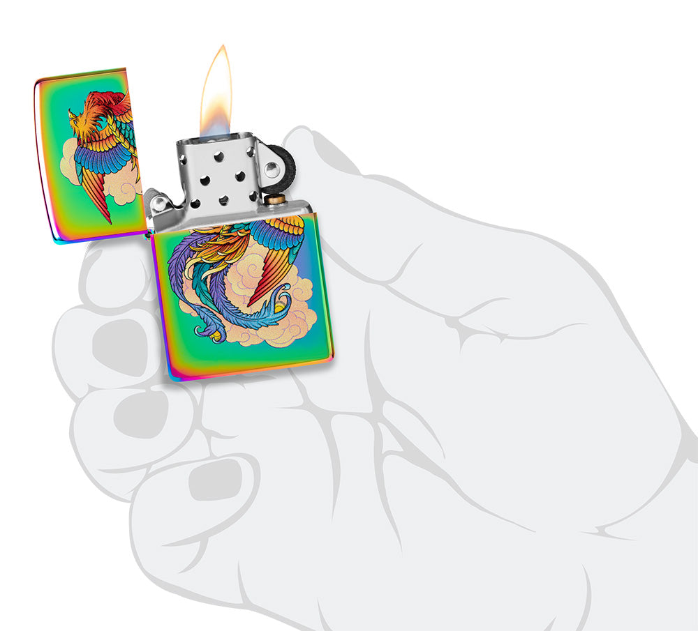 Ein leuchtender und majestätischer Phönix schwingt seine Flügel über die Oberfläche dieses schillernden mehrfarbigen Feuerzeugs und vereint sich mit dem faszinierenden Farbbild-Motiv zu einer anmutigen Komposition.