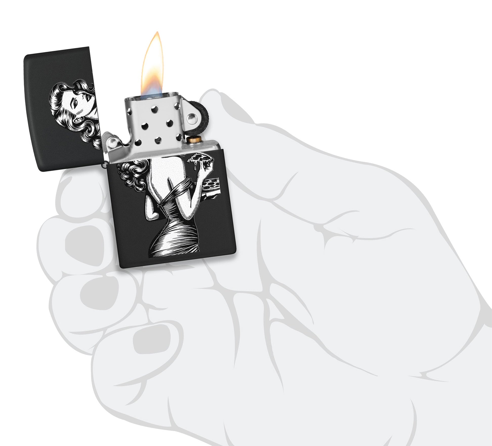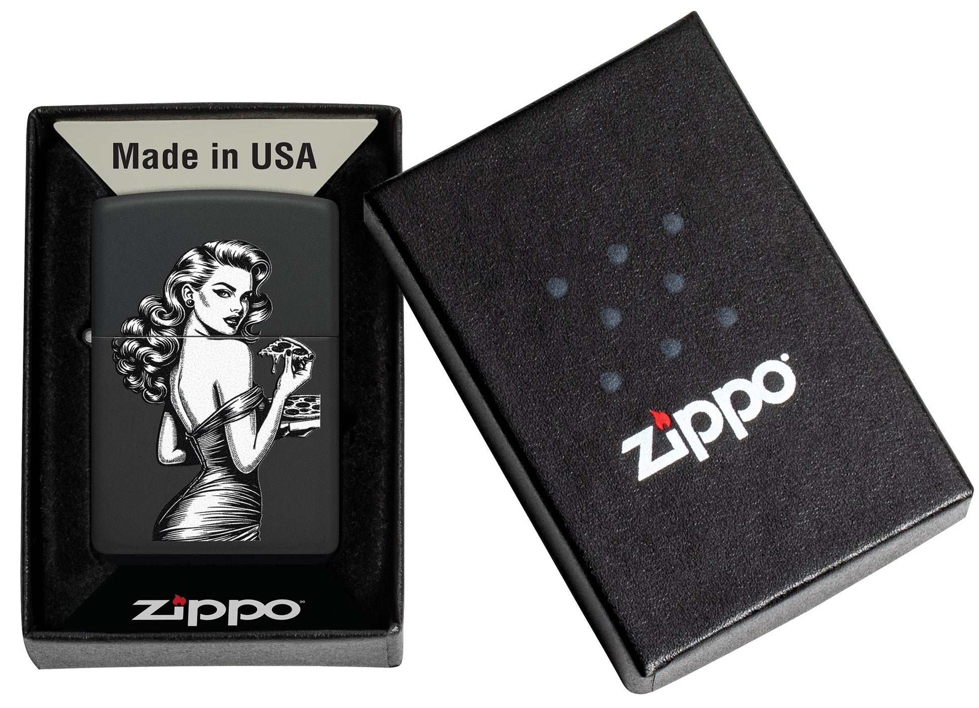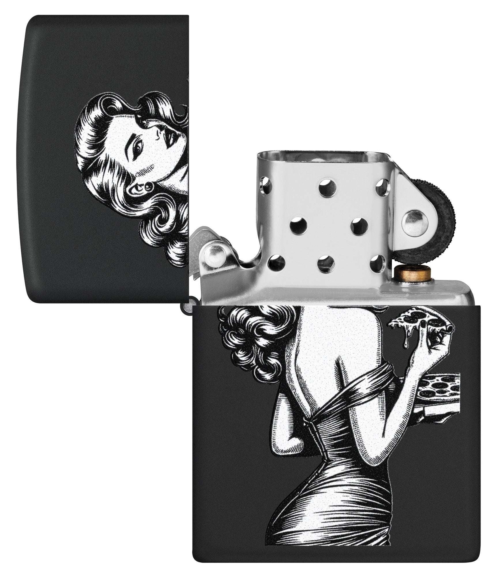Ein wunderschönes Pinup-Model posiert mit einem leckeren Stück Pizza auf diesem klassischen Feuerzeug in mattem Schwarz mit Vintage-inspiriertem Farbbilddesign.