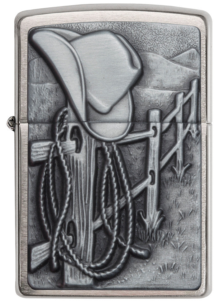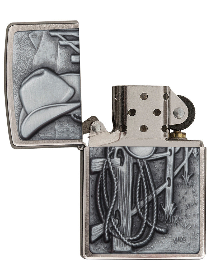 Schnapp Dir Deine Cowboystiefel, Du gehst auf ein Abenteuer! Dieses winddichte Feuerzeug aus Brushed Chrome verfügt über ein Emblem-Design im Western-Stil.