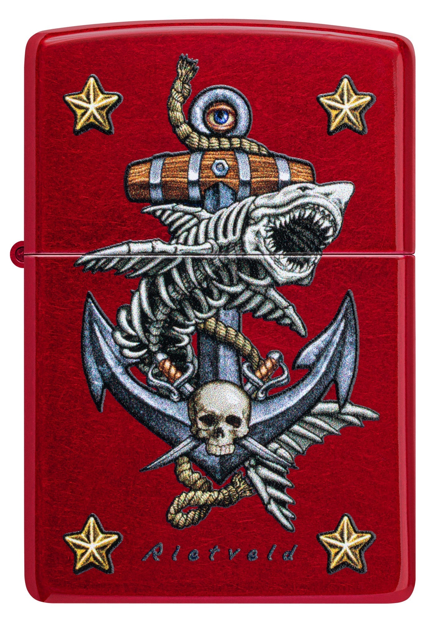 Die ikonische Kunstfertigkeit von Rick Rietveld erwacht auf diesem klassischen Feuerzeug in Candy Apple Red zum Leben. Das nautische Farbbilddesign zeigt einen Anker, der mit einem Skelett-Hai und einem Piratenschädel verziert ist.