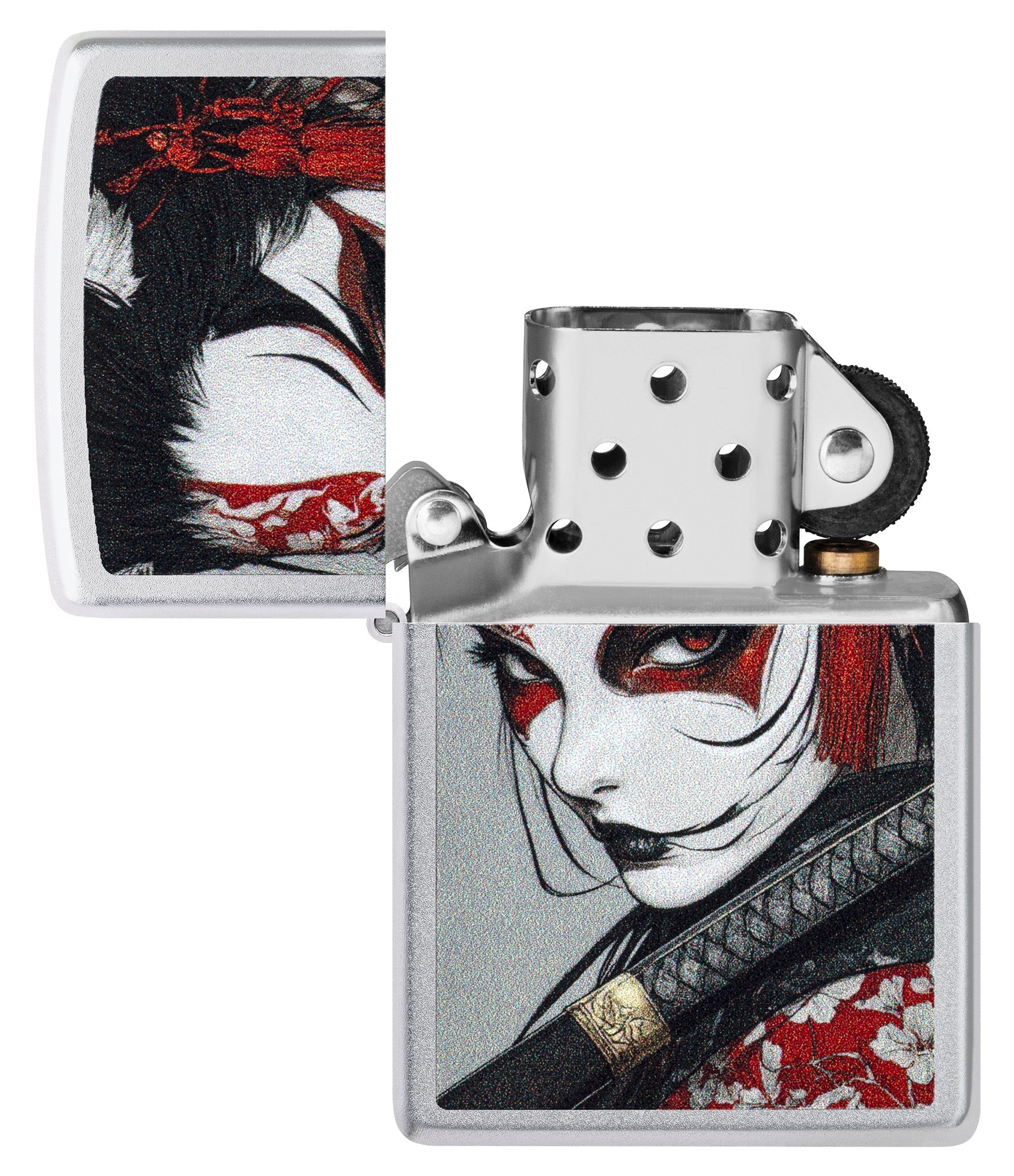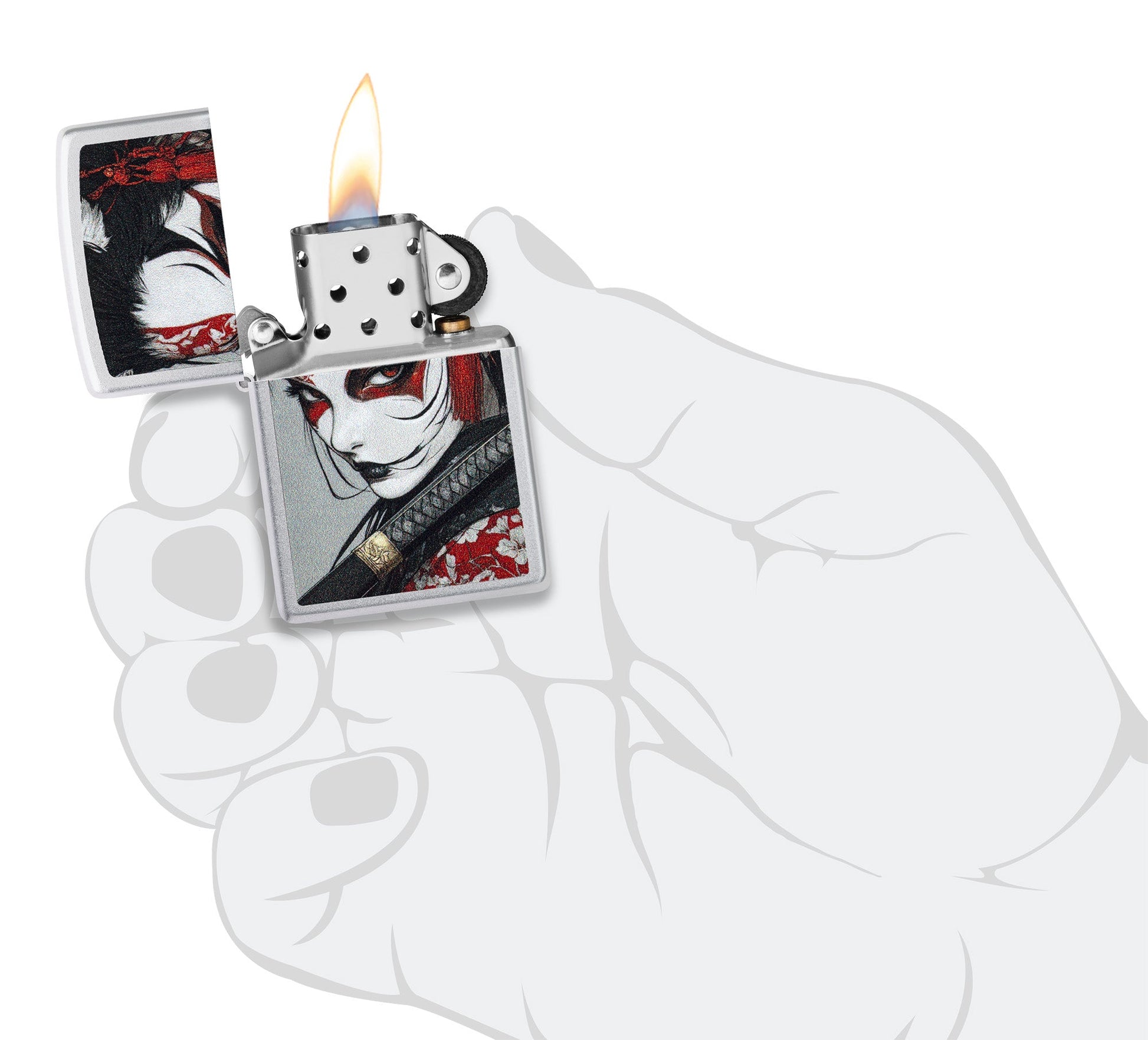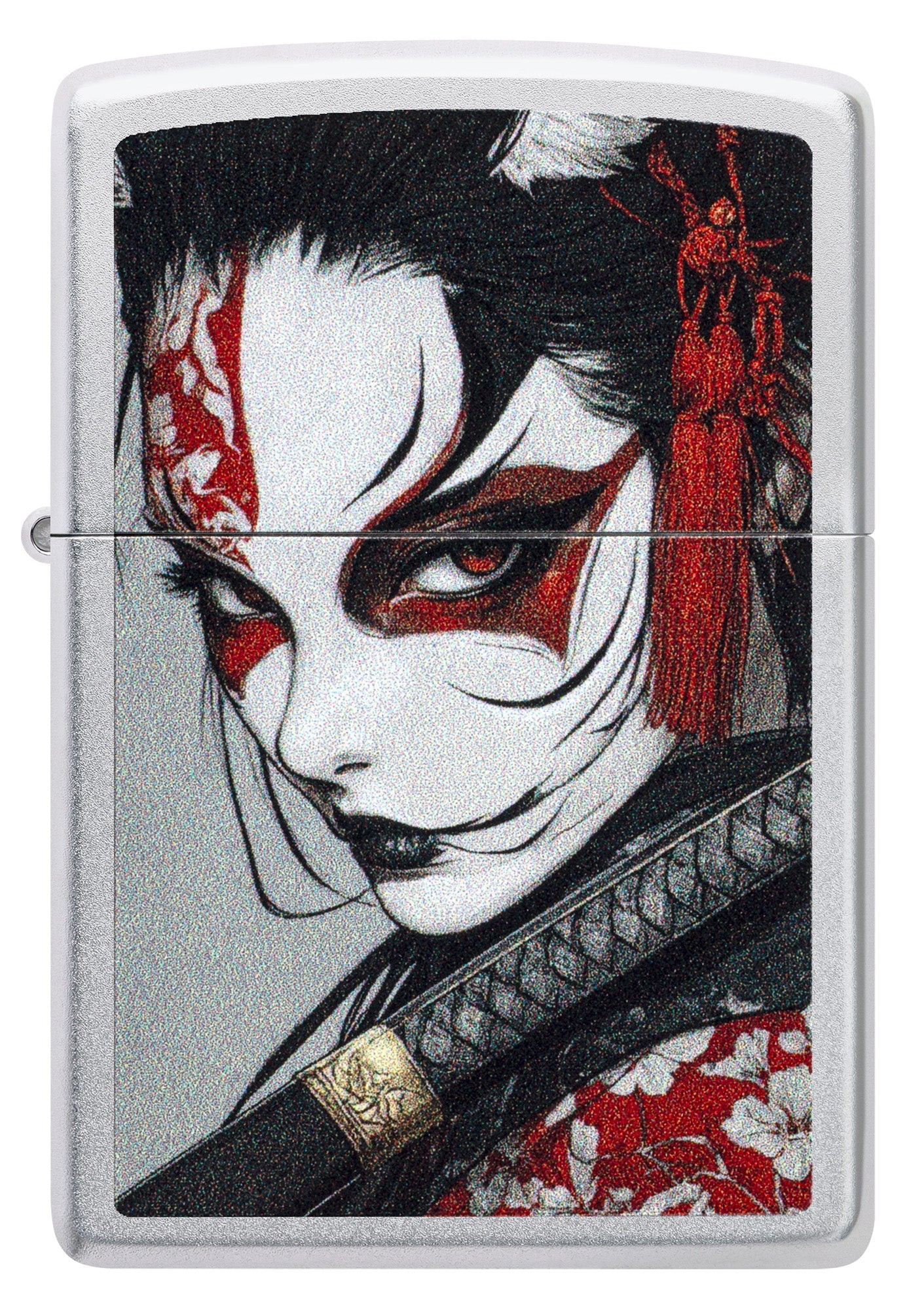 Im feudalen Japan trainierten Kriegerinnen sowohl für den Kampf als auch zur Verteidigung ihrer Häuser und ihres Landes. Dieses klassische Feuerzeug in satiniertem Chrom zeigt eine tapfere Samuraifrau im lebendigen Farbbilddesign.