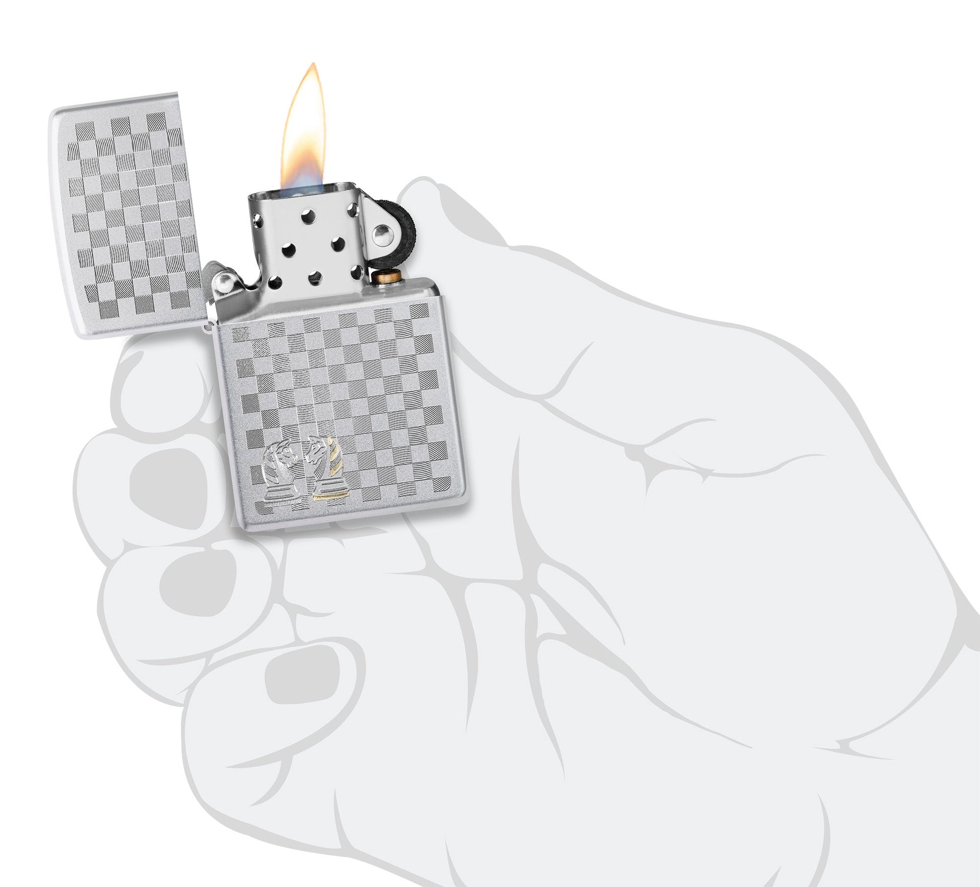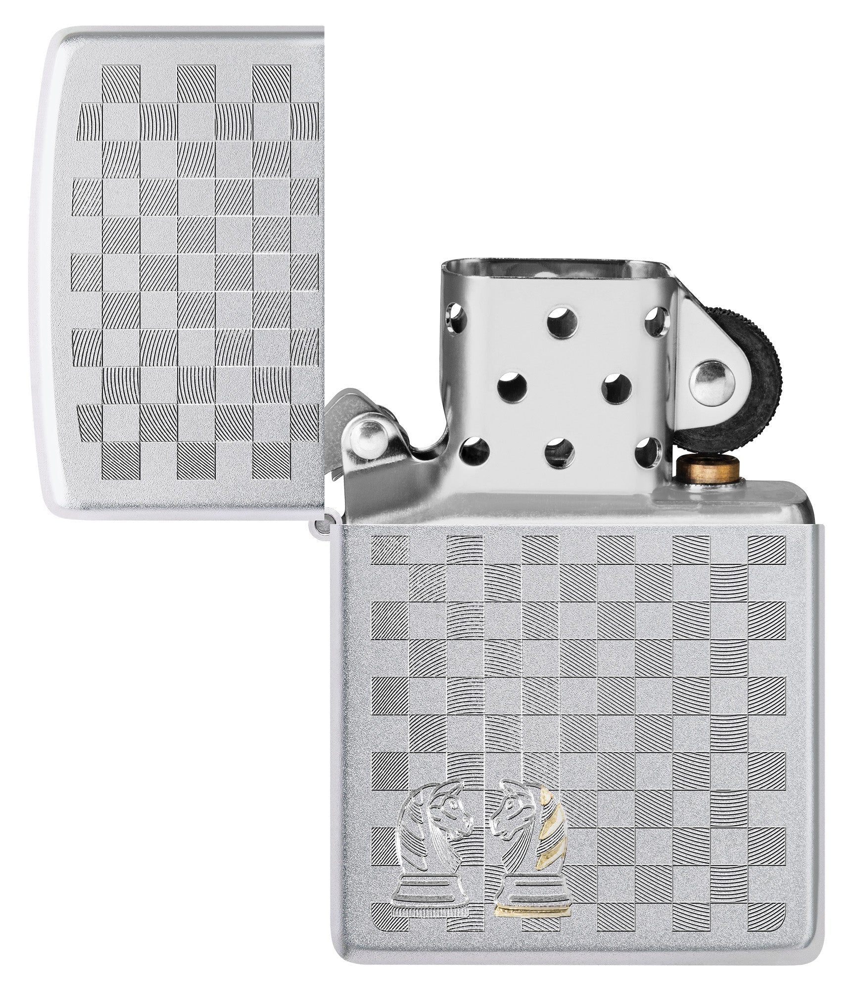 Ob Sie nun Schachfan sind oder sich für taktische Strategien begeistern, dieses klassische Feuerzeug in satiniertem Chrom wird Ihnen gefallen. Auf der Vorderseite ist ein klassisches Schachbrett eingraviert, geerdet von zwei sich konfrontierenden Springern in feiner, zweifarbiger Ausführung.