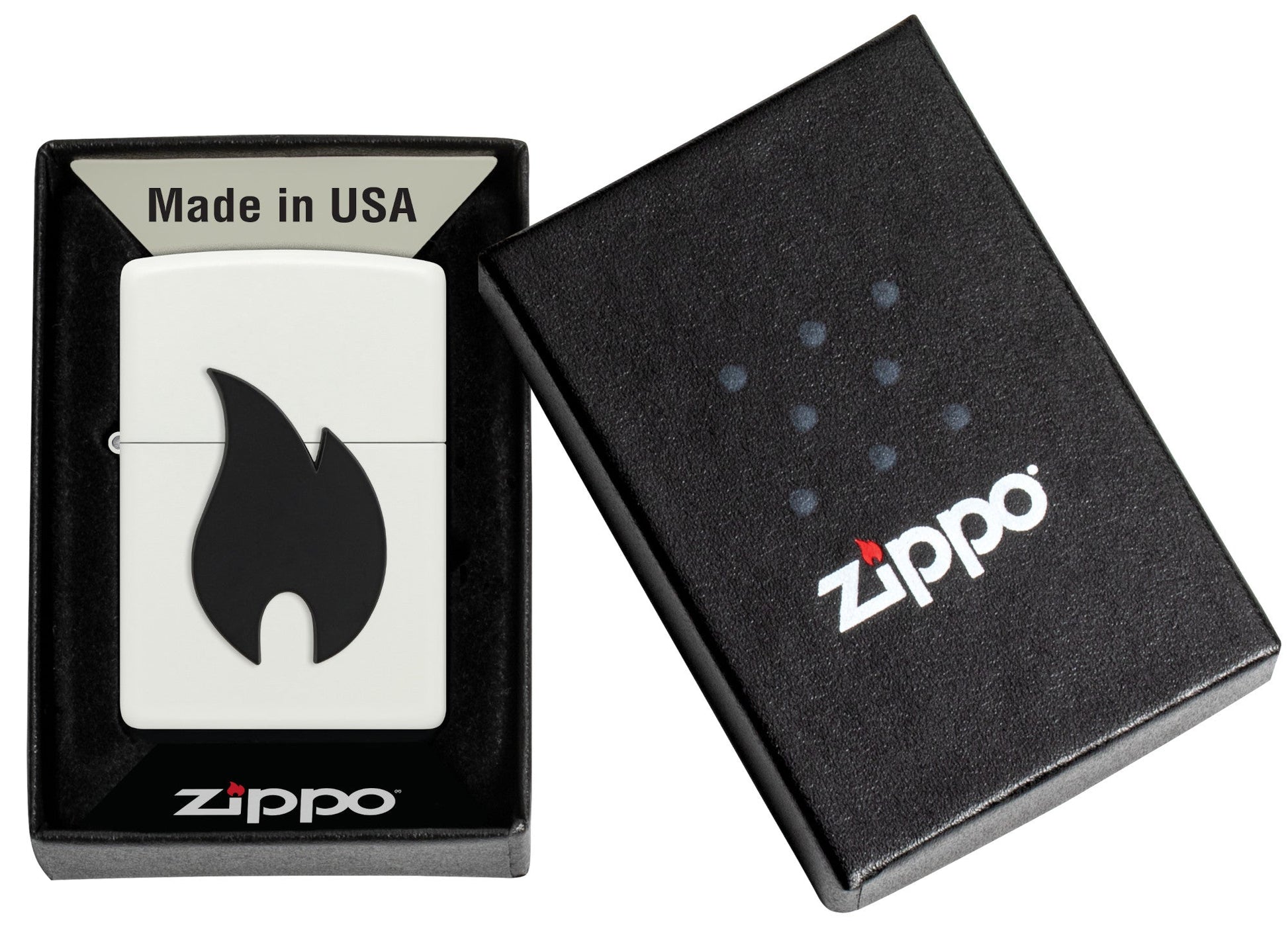 Dieses klassische Feuerzeug in mattem Weiß zeigt das Flammensymbol von Zippo als tiefschwarzes Metallemblem, das auch beim Öffnen des Feuerzeugs unverändert bleibt.