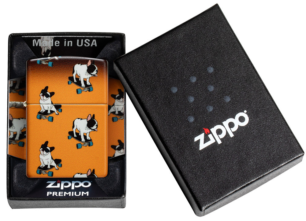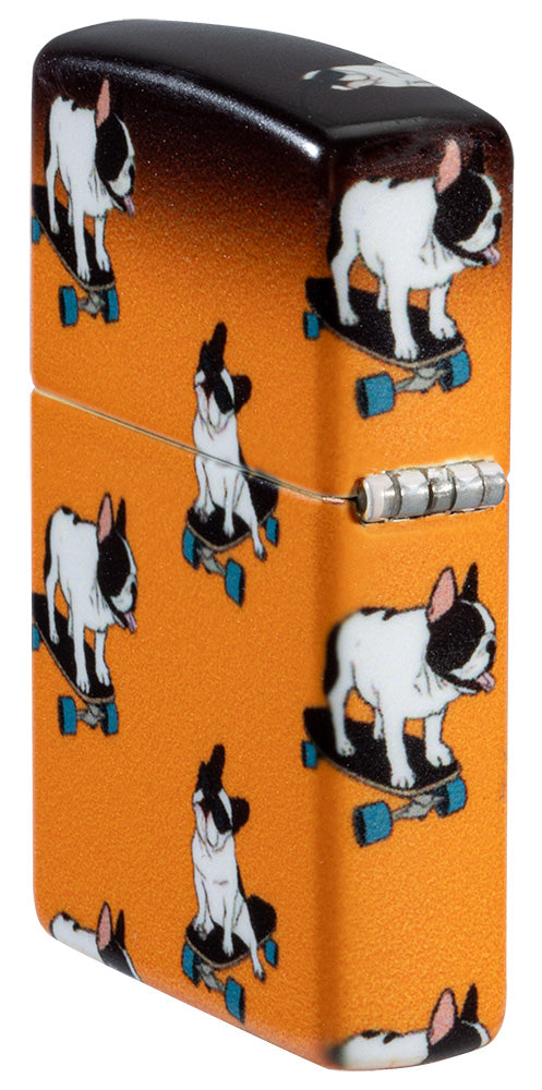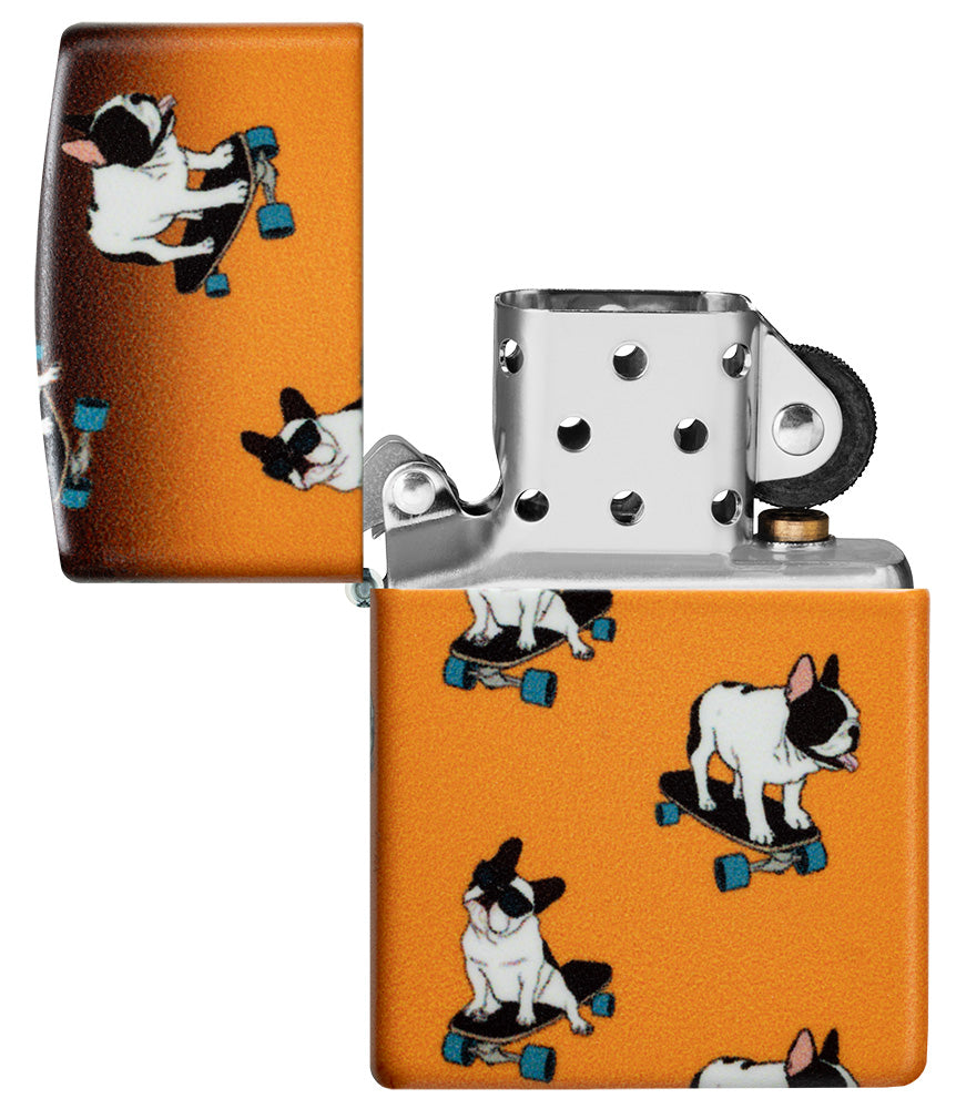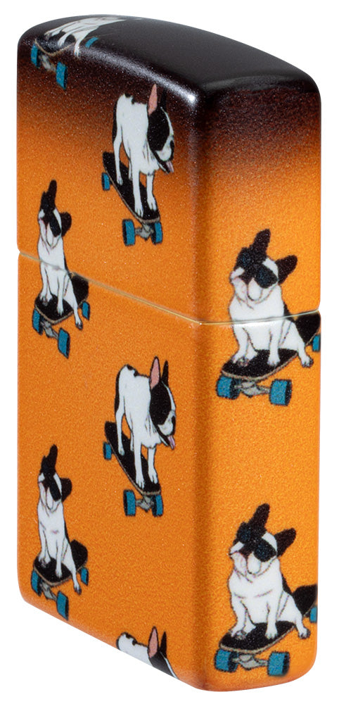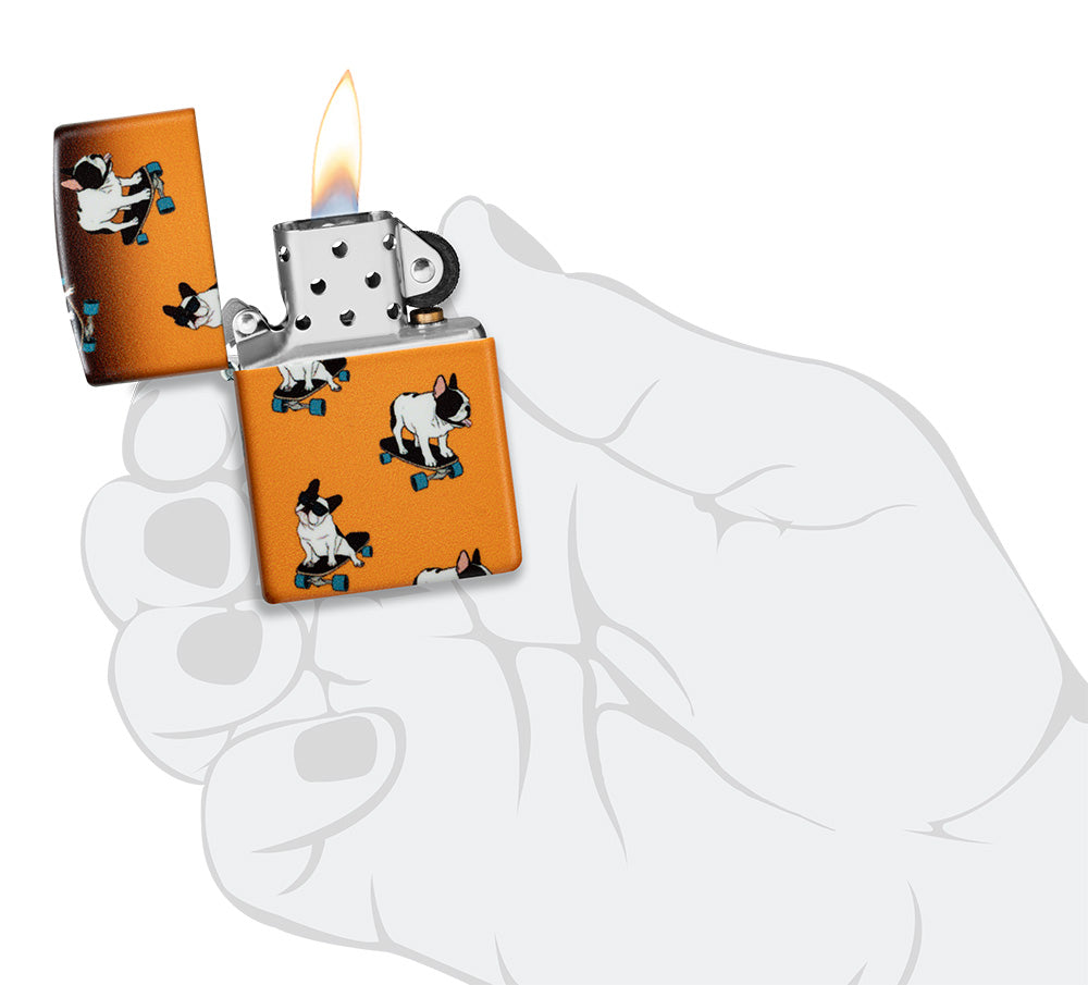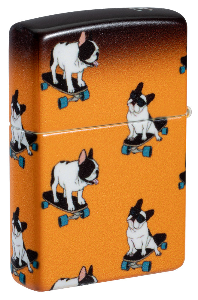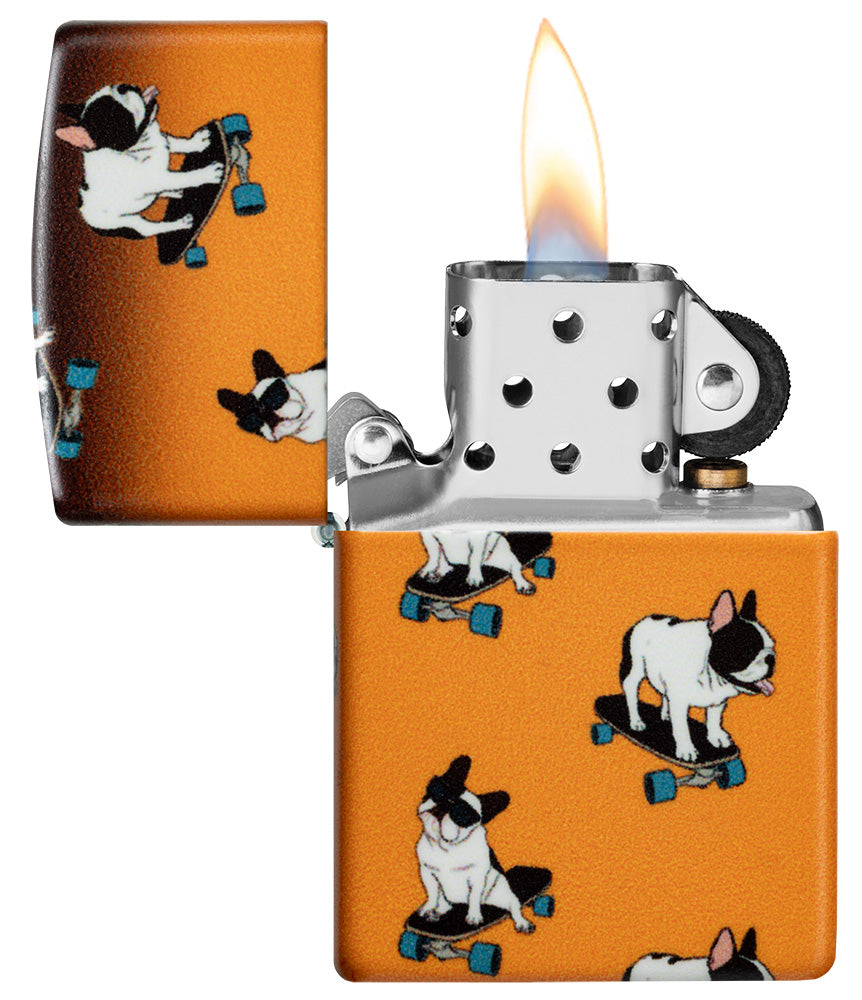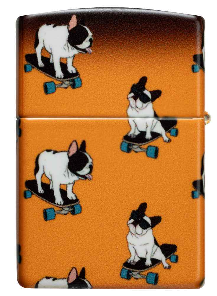 Auf diesem liebenswerten 540° Color-Feuerzeug skatet ein Paar französischer Bulldoggen in einem auffälligen, sich wiederholenden Motiv über alle Oberflächen.