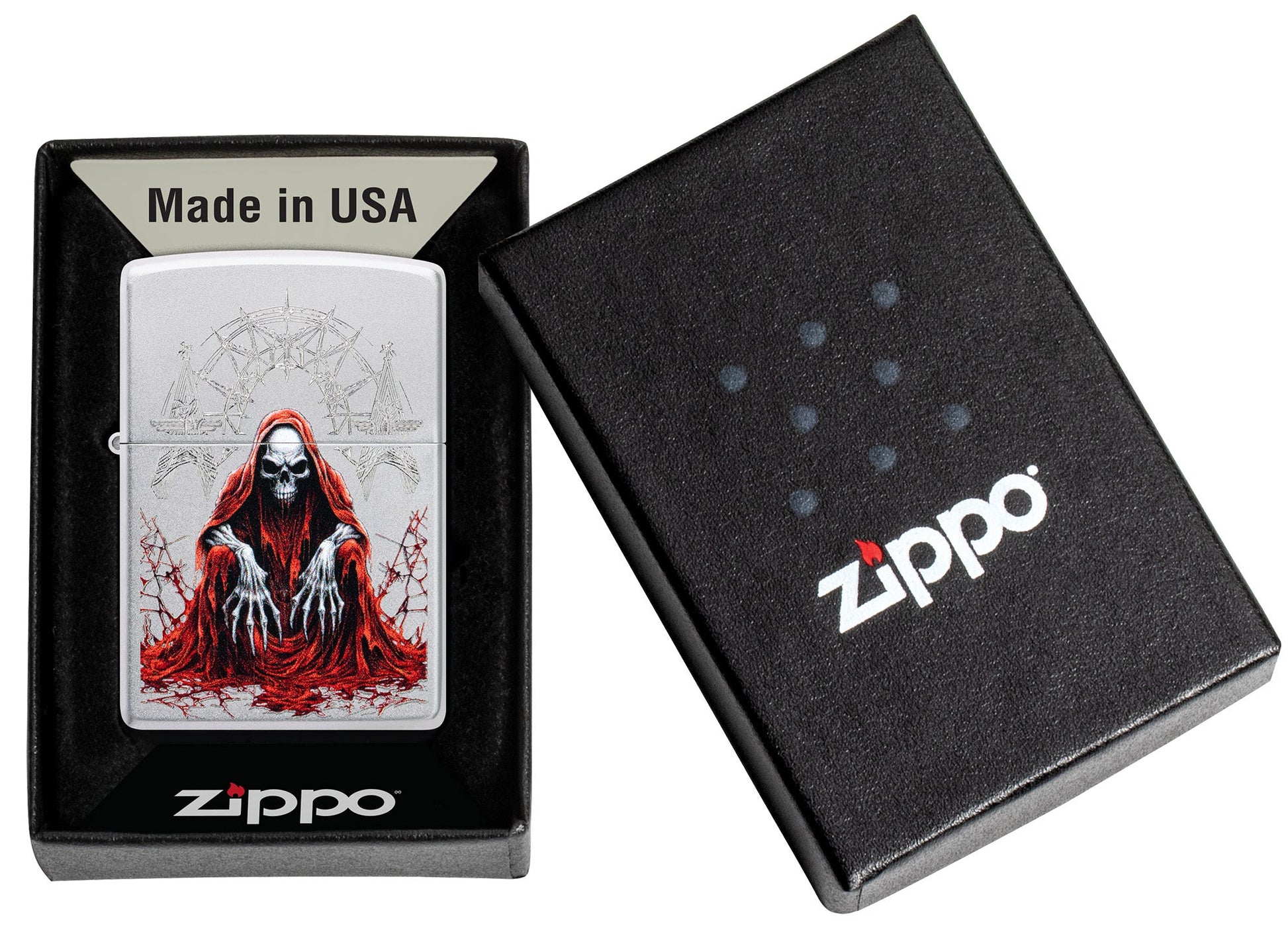 In eine blutrote Robe gehüllt kriecht ein furchterregender Sensenmann in einem gruseligen Farbbilddesign auf den Vordergrund dieses klassischen Feuerzeugs aus satiniertem Chrom zu. Ein gotischer Bogen in unserer Autogravur-Textur verleiht der Oberfläche des Feuerzeugs Tiefe und Struktur.