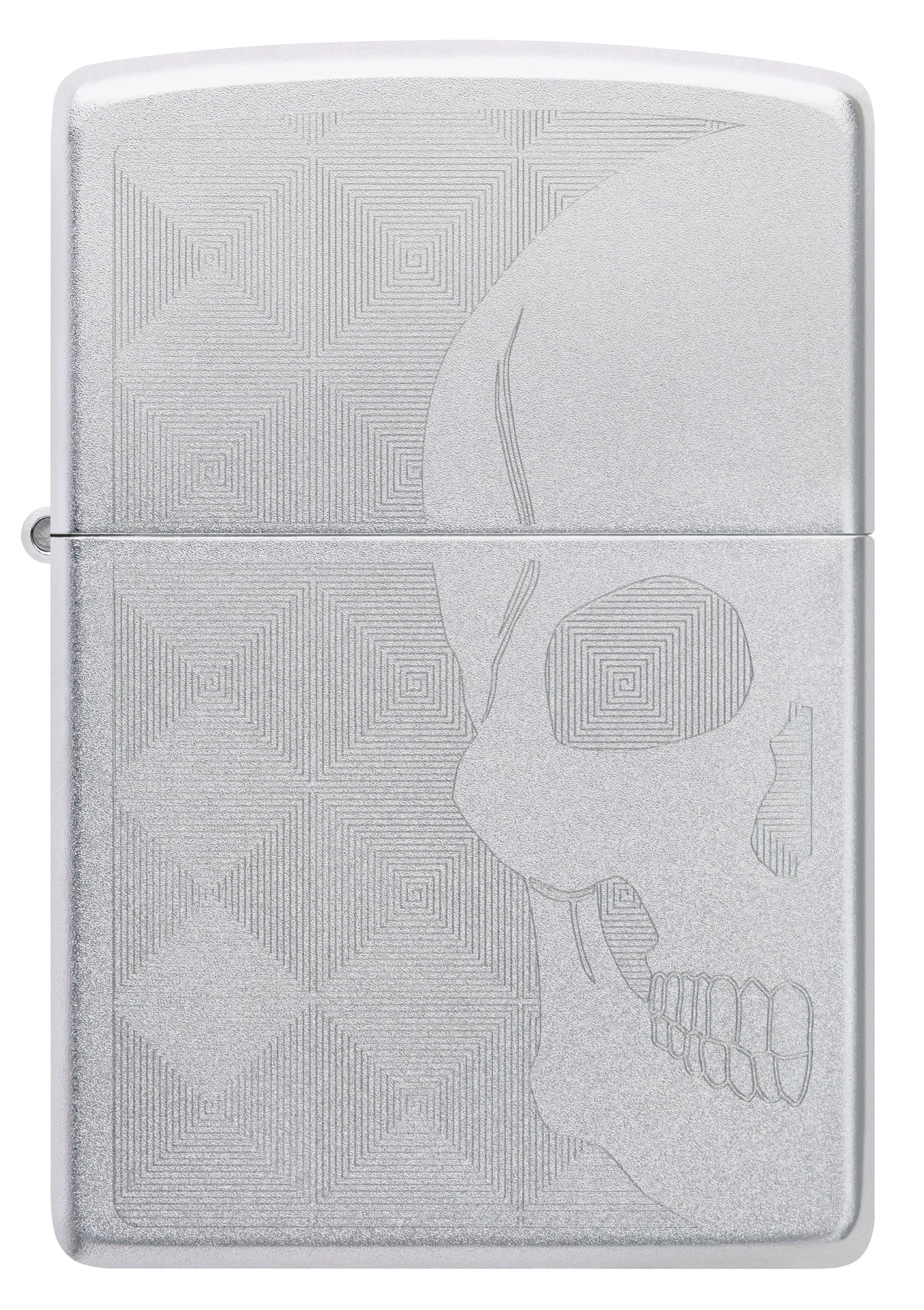 Auf diesem Feuerzeug in Satin Chrome haben wir mit Auto Engrave einen Totenkopf in den Negativbereich dieses faszinierenden geometrischen Designs graviert.