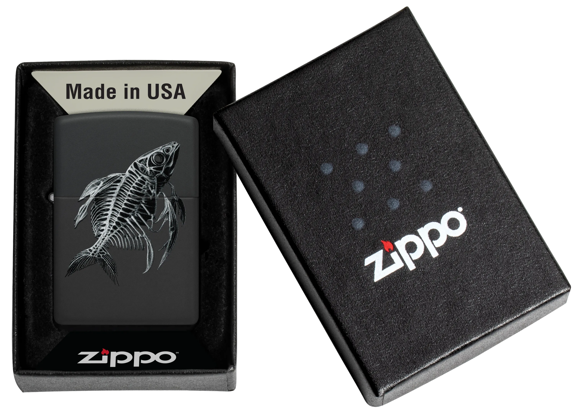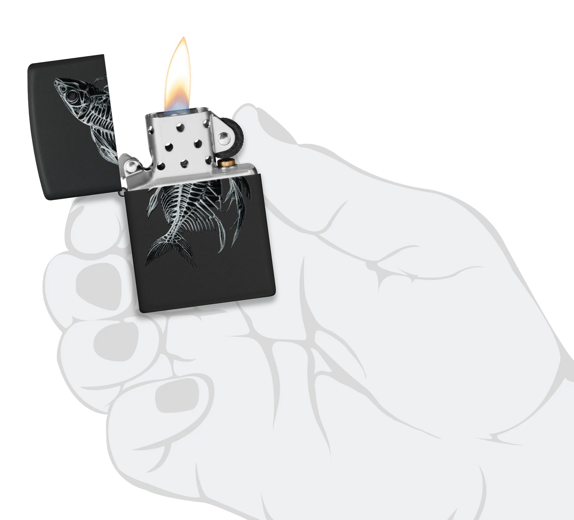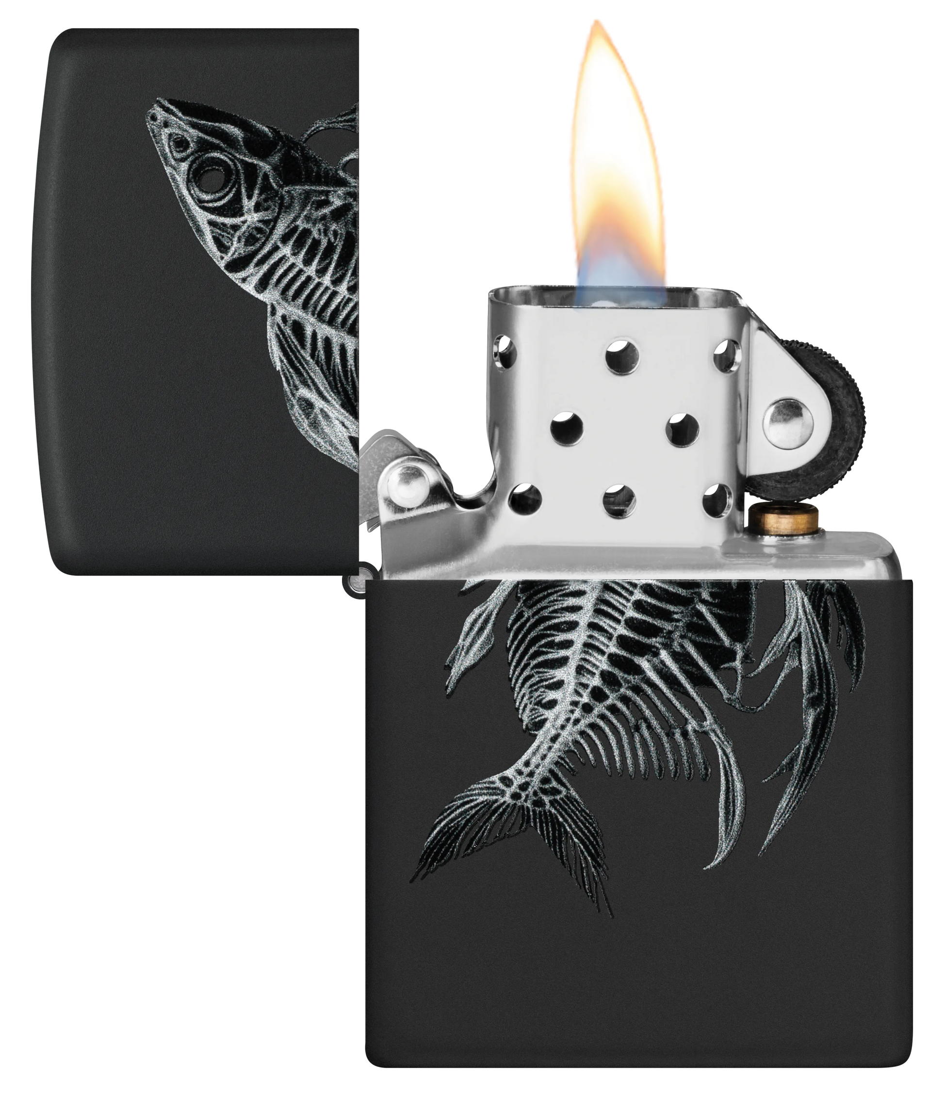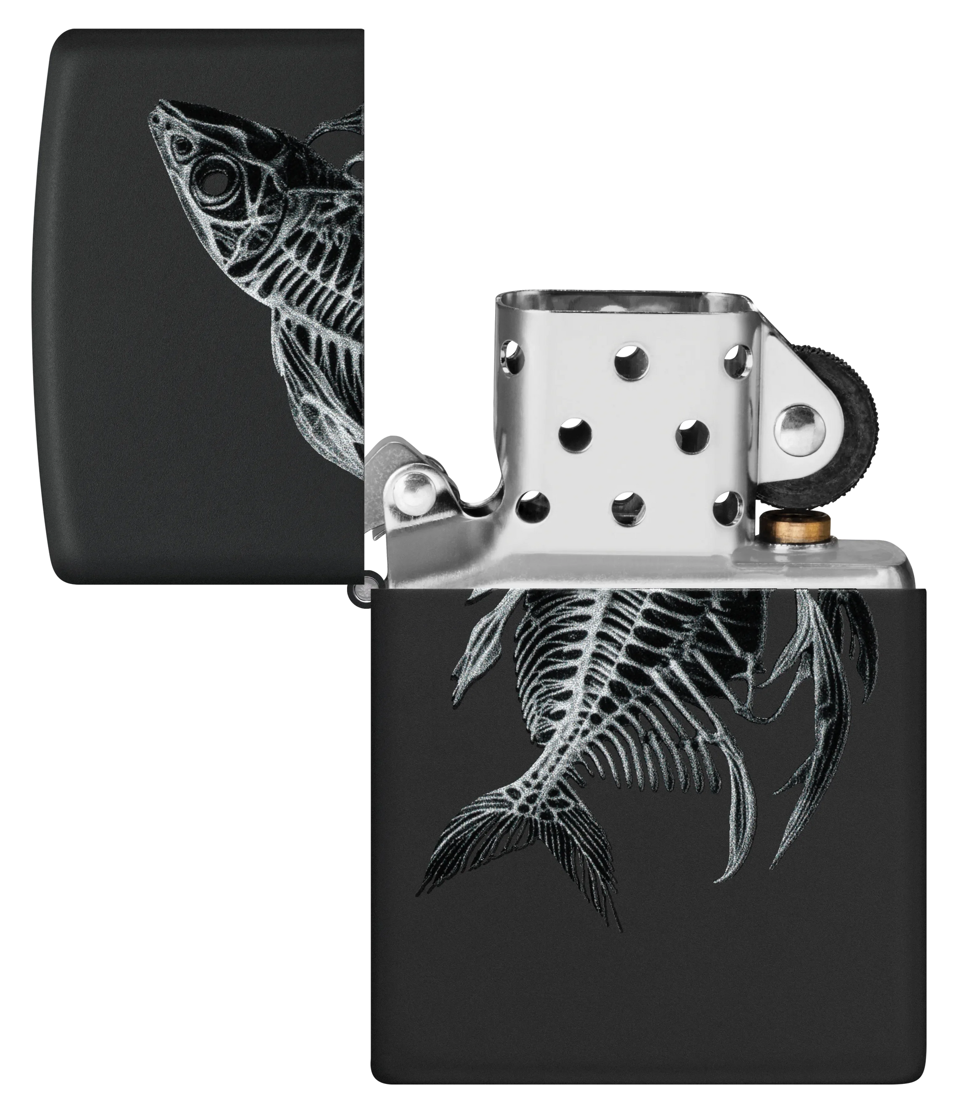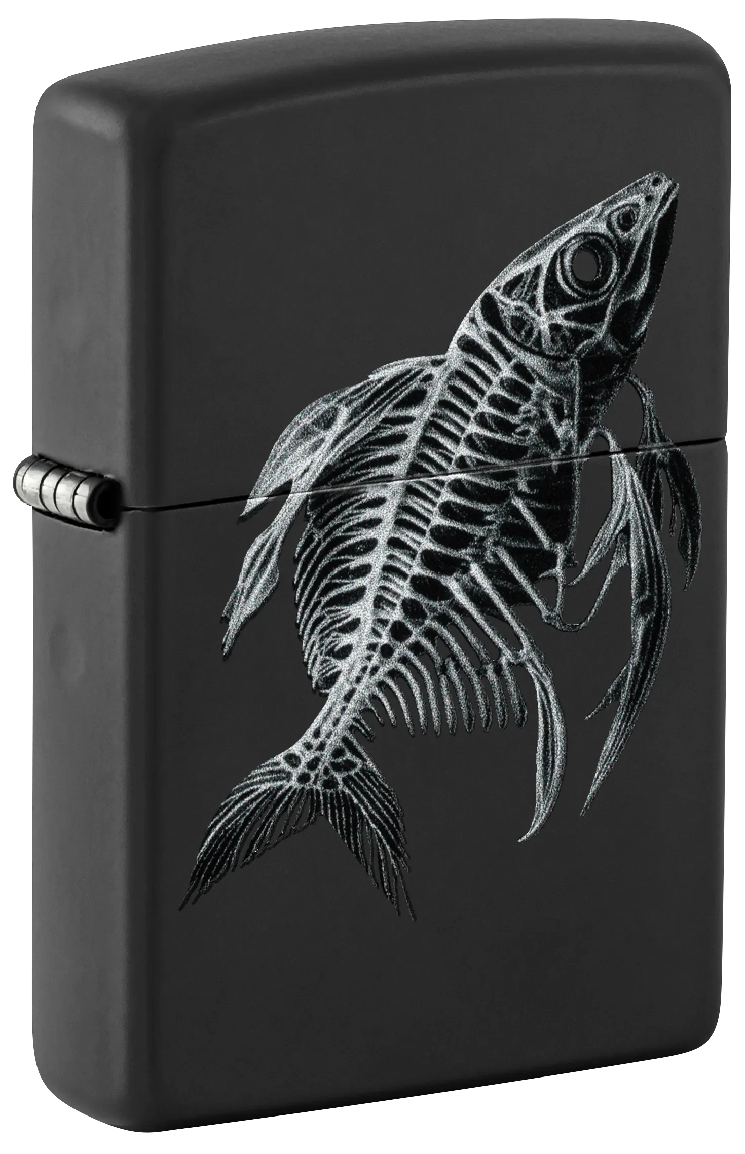 Über die Oberfläche dieses klassischen Black Matte-Feuerzeugs zieht sich ein detailreiches Fischskelett in einem unheimlichen Color Image-Design.