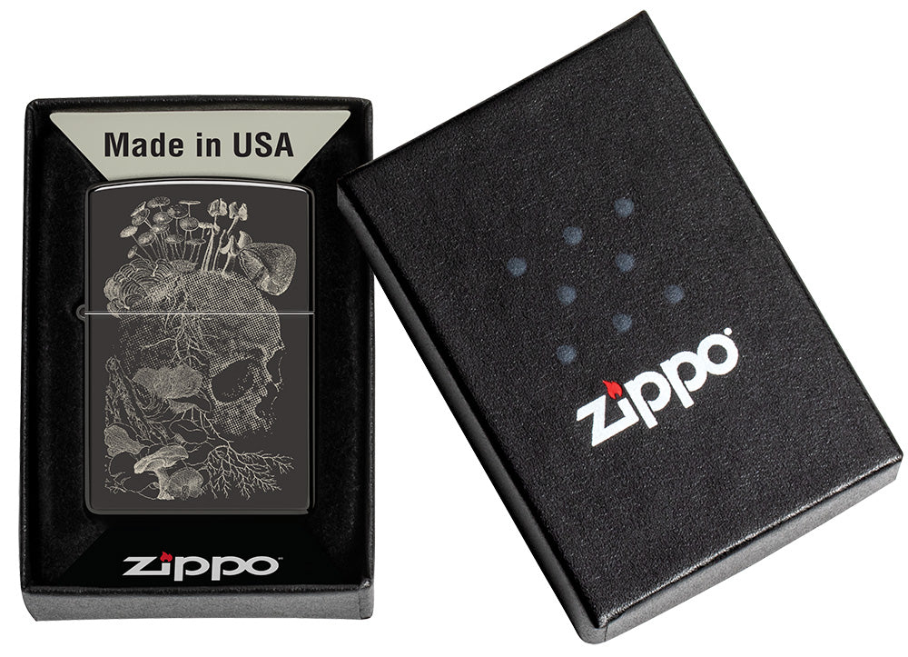 Das Leben und der Tod werden bei diesem attraktiven Feuerzeug in hochglänzendem Schwarz romanhaft nebeneinander gestellt. Das Fotobild-Motiv zeigt einen Totenkopf und Pilze in allen Details und nutzt spielerisch den glänzenden Hintergrund darunter.