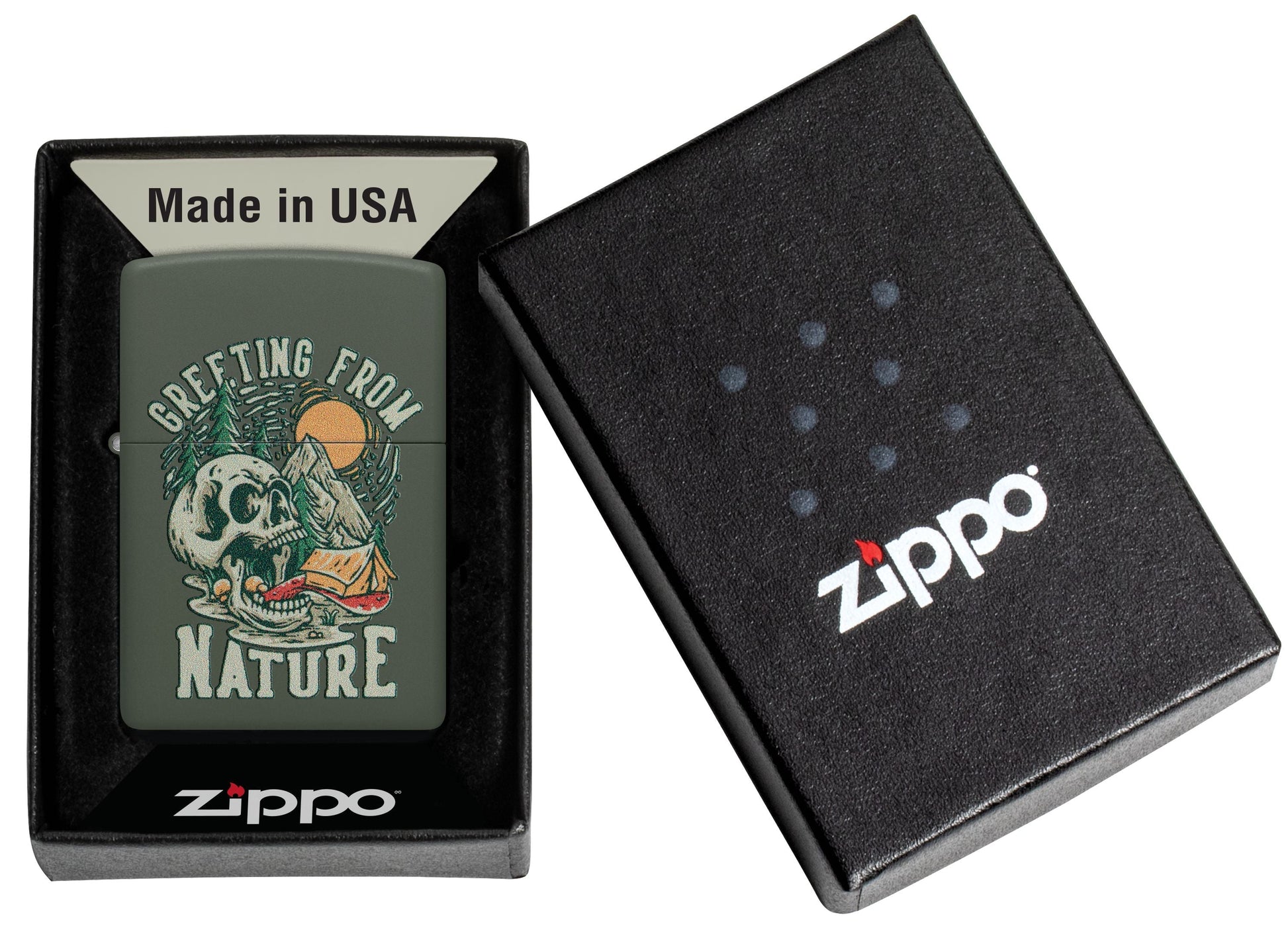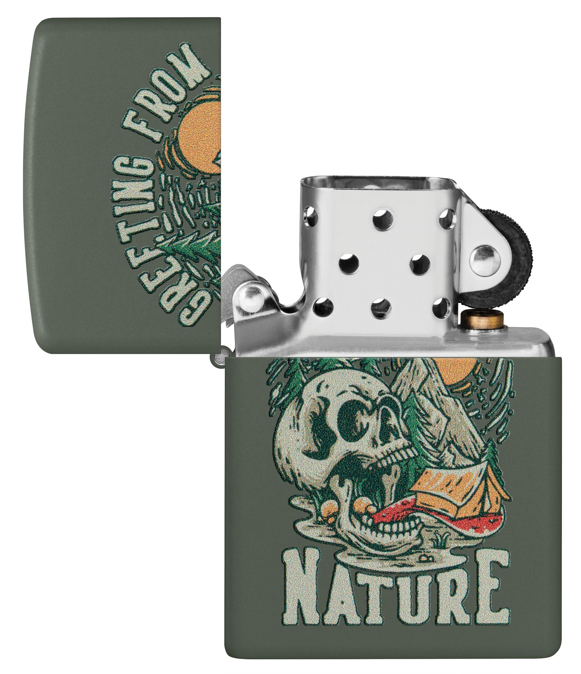 Nichts wie raus in die Natur mit diesem skurrilen Feuerzeug in Green Matte. Das humorvolle Color Image-Design zeigt einen riesigen Totenkopf, der in eine heitere Landschaft mit der Aufschrift „Greeting from Nature“ eingebettet ist.