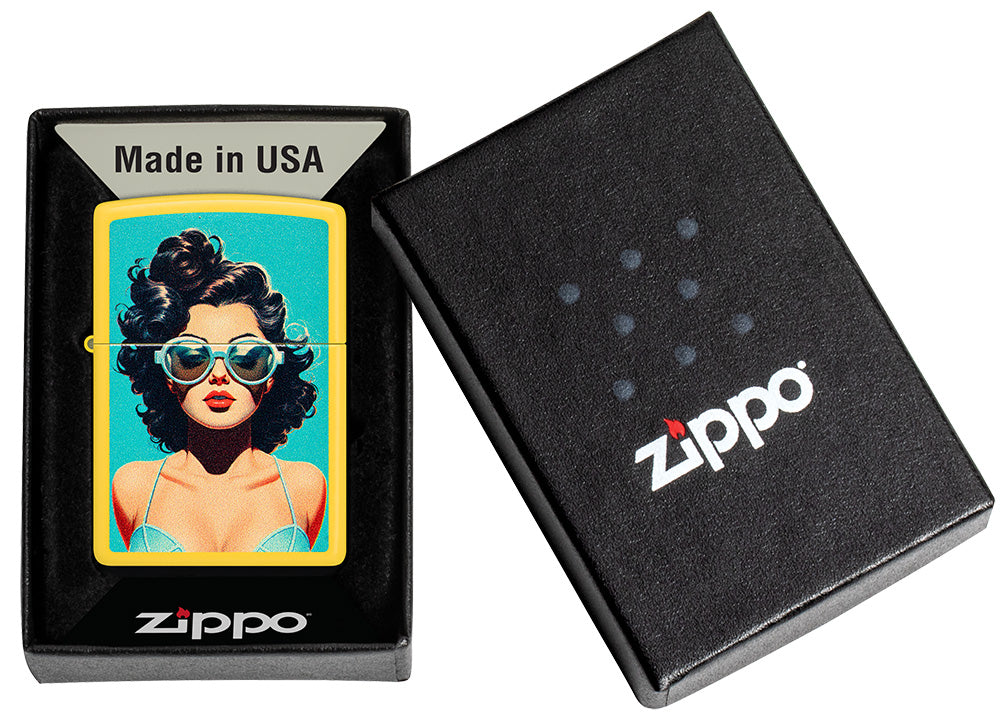 Ein glamouröses Model posiert auf der Oberfläche dieses klassischen Sunflower Feuerzeugs in einem hellen und sonnigen Color Image Design.