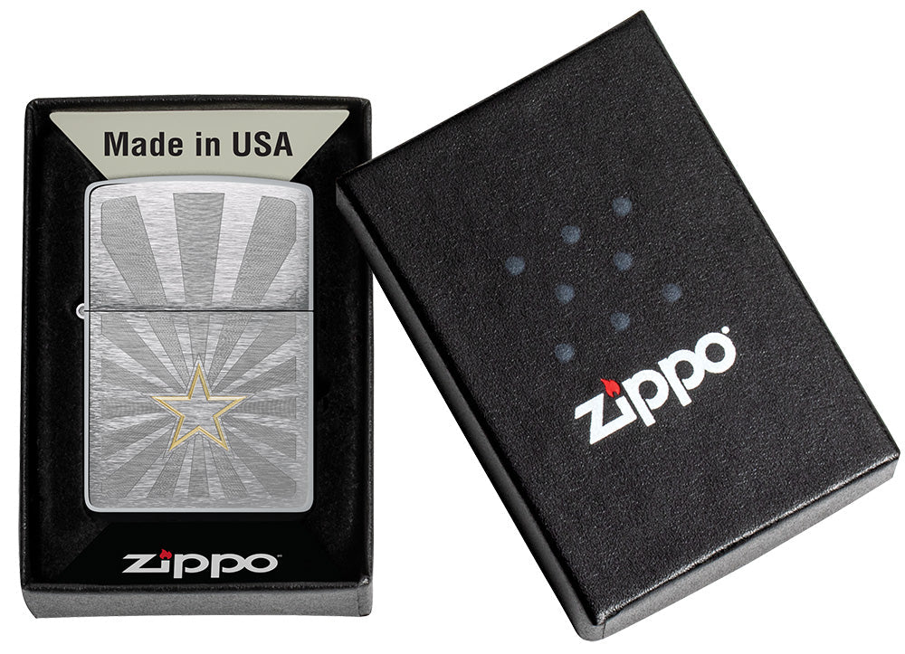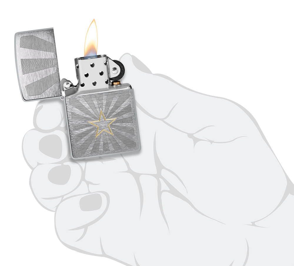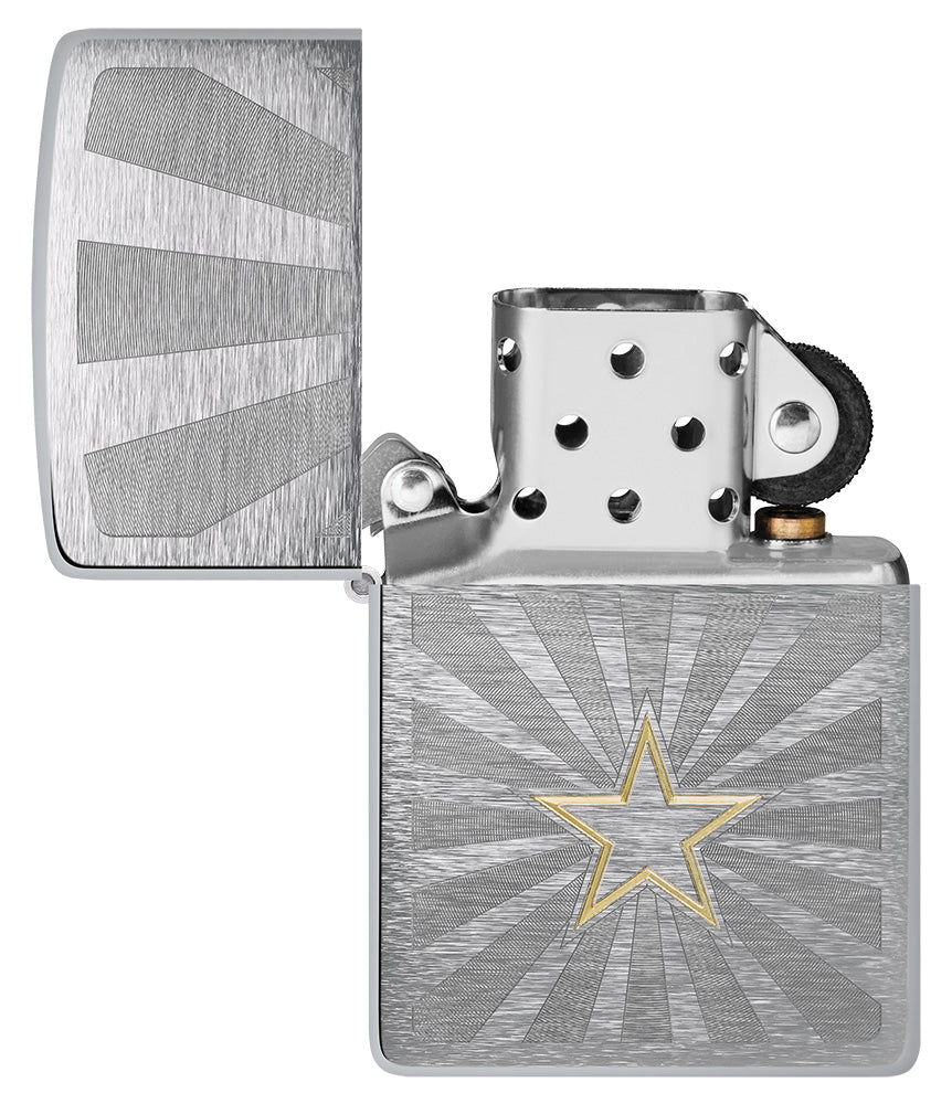 Inmitten von Strahlen aus dem Zentrum dieses klassischen Feuerzeugs in Brushed Chrome glänzt dank unseres Auto Two-Tone-Verfahrens ein Stern in glitzernden Messingtönen.