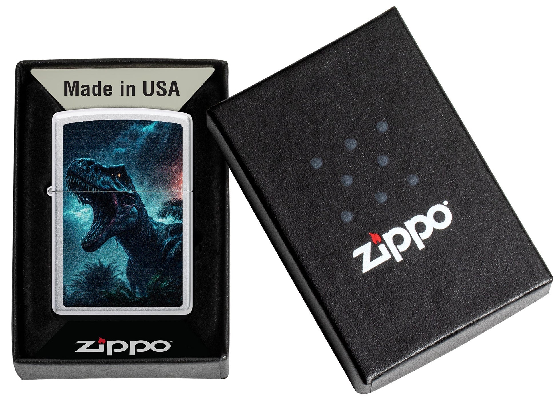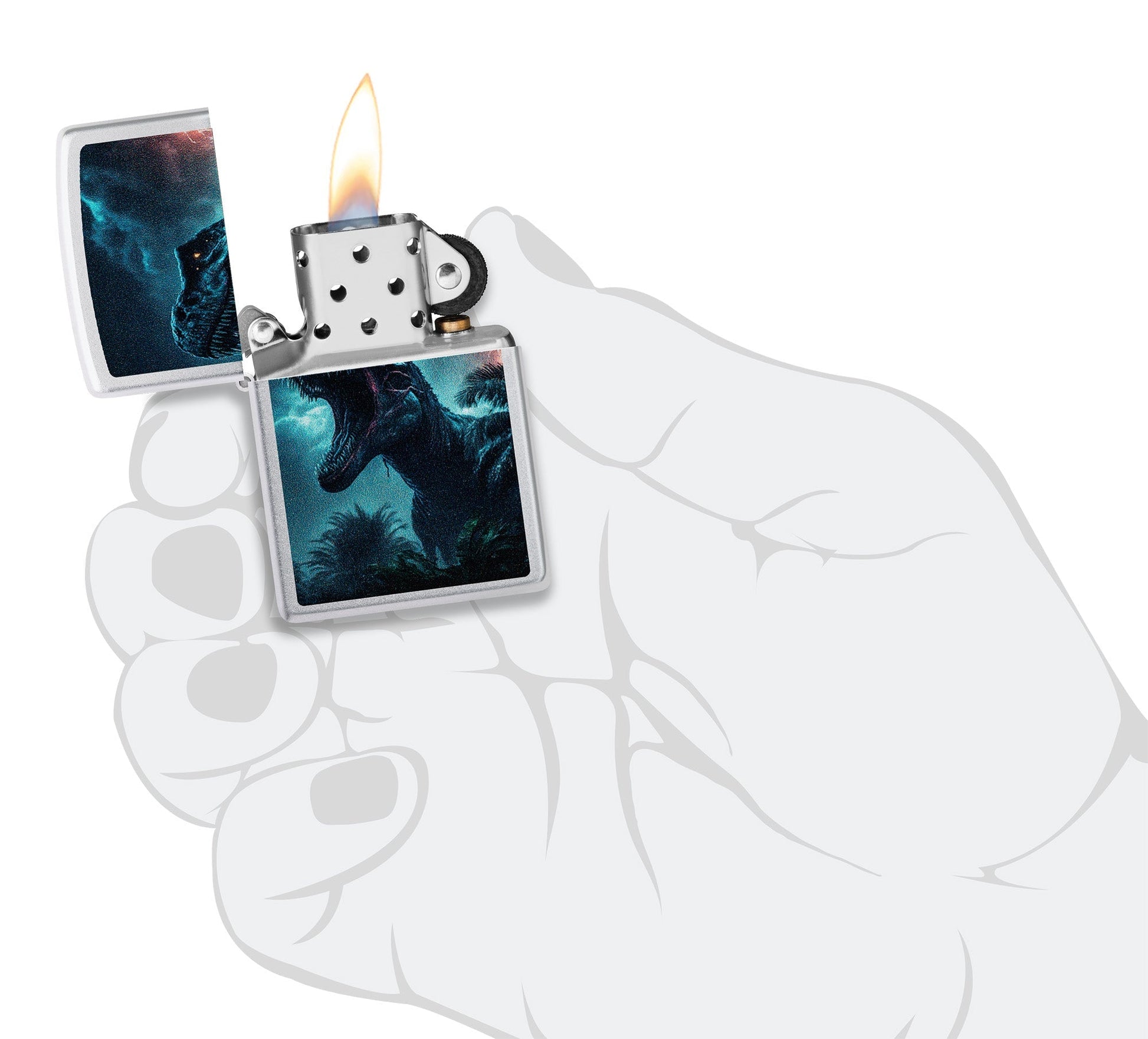 Dieses klassische Feuerzeug in satiniertem Chrom entführt dich zurück in die Jurazeit. Ein wilder Tyrannosaurus Rex bricht in diesem bedrohlichen Farbbilddesign unter stürmischem Himmel durch das Dschungelgrün.