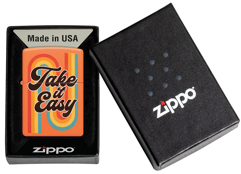 Dieses verspielte Feuerzeug in Orange Matte gibt einen einfachen Ratschlag. „Take it easy“ erscheint in einem groovigen Text über einem fließenden Hintergrund im kühnen Color Image-Design.