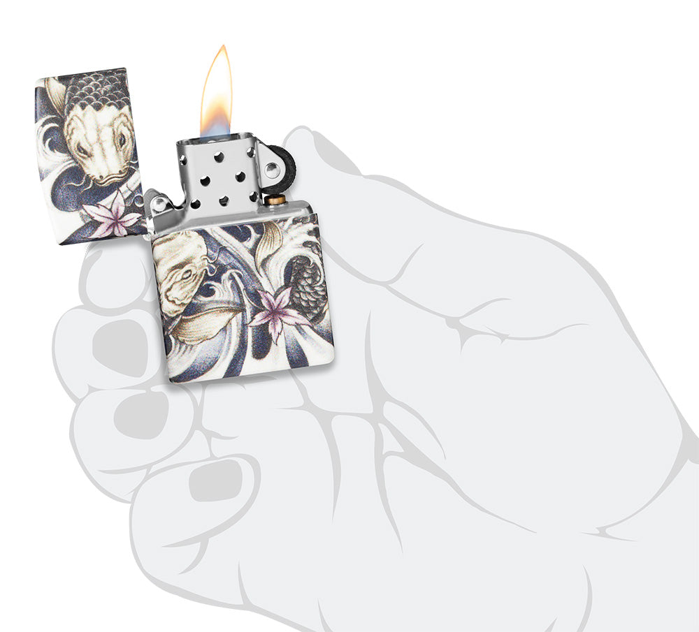 Ein anmutiges Paar Koi-Fische wirbelt um alle Seiten dieses atemberaubenden, von Tattoos inspirierten Feuerzeugs. Ganz gleich, ob Du Dich von ihrer Symbolik oder einfach von ihrer Schönheit angezogen fühlst, dieses 540° Color Image-Motiv fängt die Bewegung und die Details der Kois in einer beruhigenden, gedämpften Farbpalette perfekt ein.