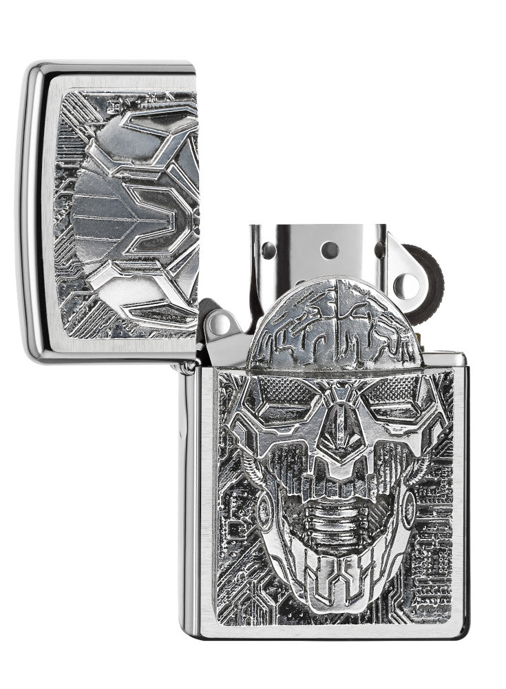 Ein Roboterschädel dominiert die Oberfläche dieses Feuerzeugs in Brushed Chrome mit einem kunstvoll geschnitzten Metallemblem. Unter dem Deckel des Feuerzeugs befindet sich als Überraschung ein Gehirn-Emblem.