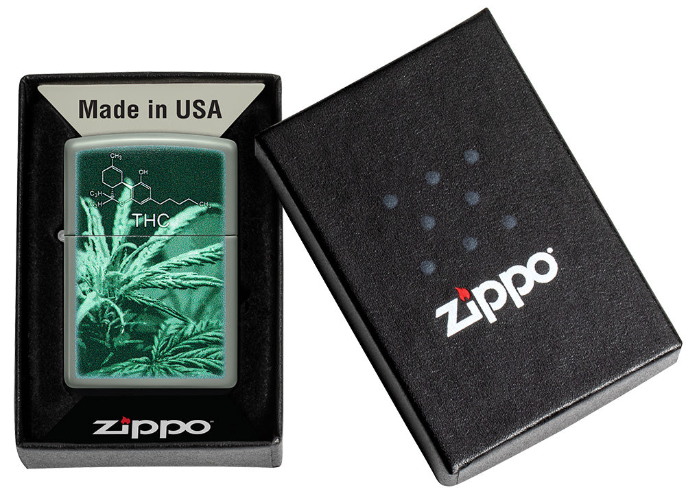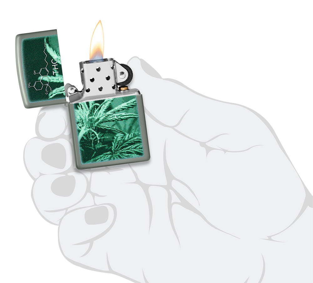 Lebensechte Cannabisblätter entfalten sich unter der Formel für THC in einem entspannenden Farbbild-Design auf diesem klassischen Sage-Feuerzeug. Wird in einer Geschenkbox verpackt. Für optimale Leistung, füllen Sie mit Zippo Feuerzeugbenzin.