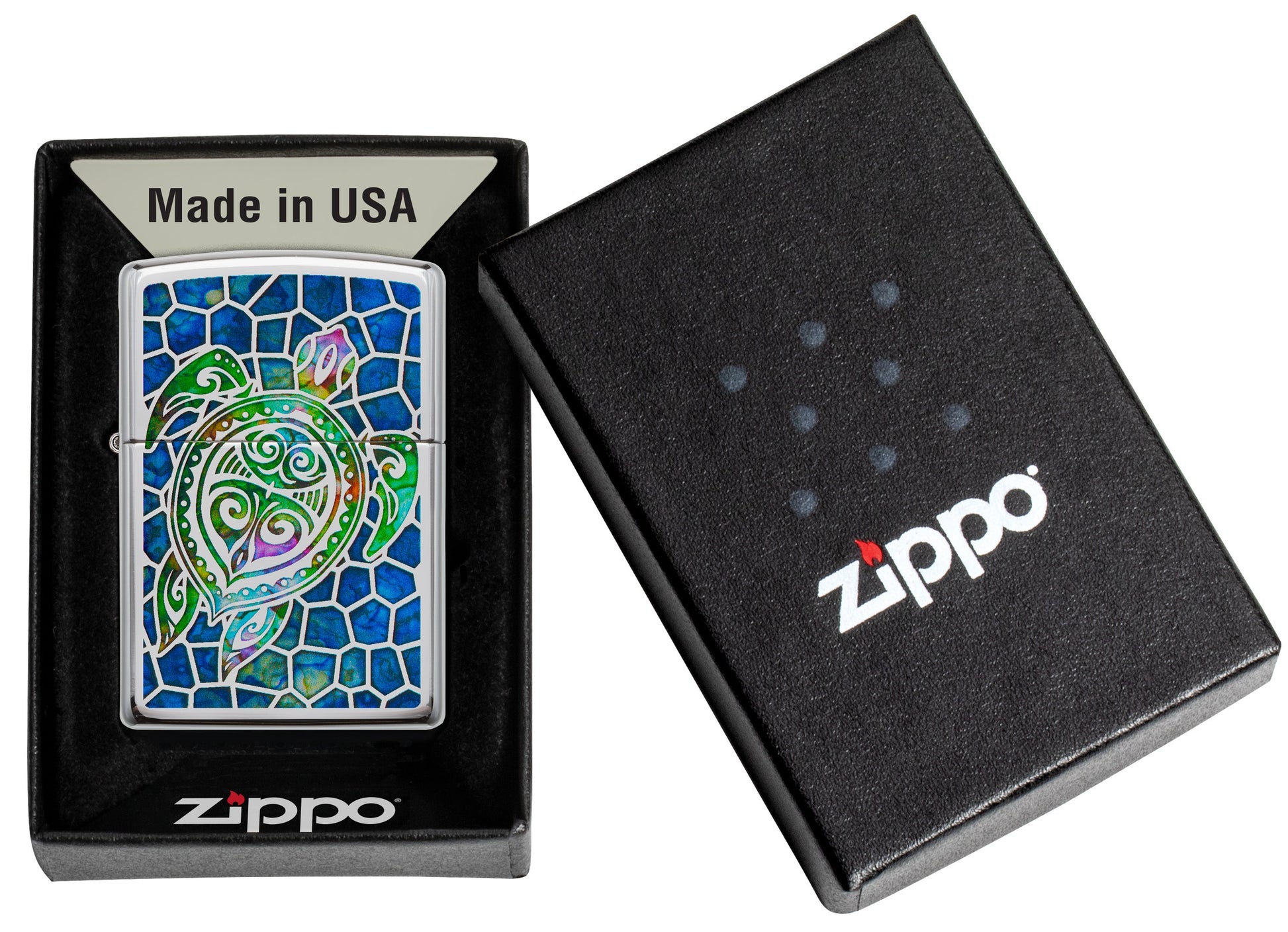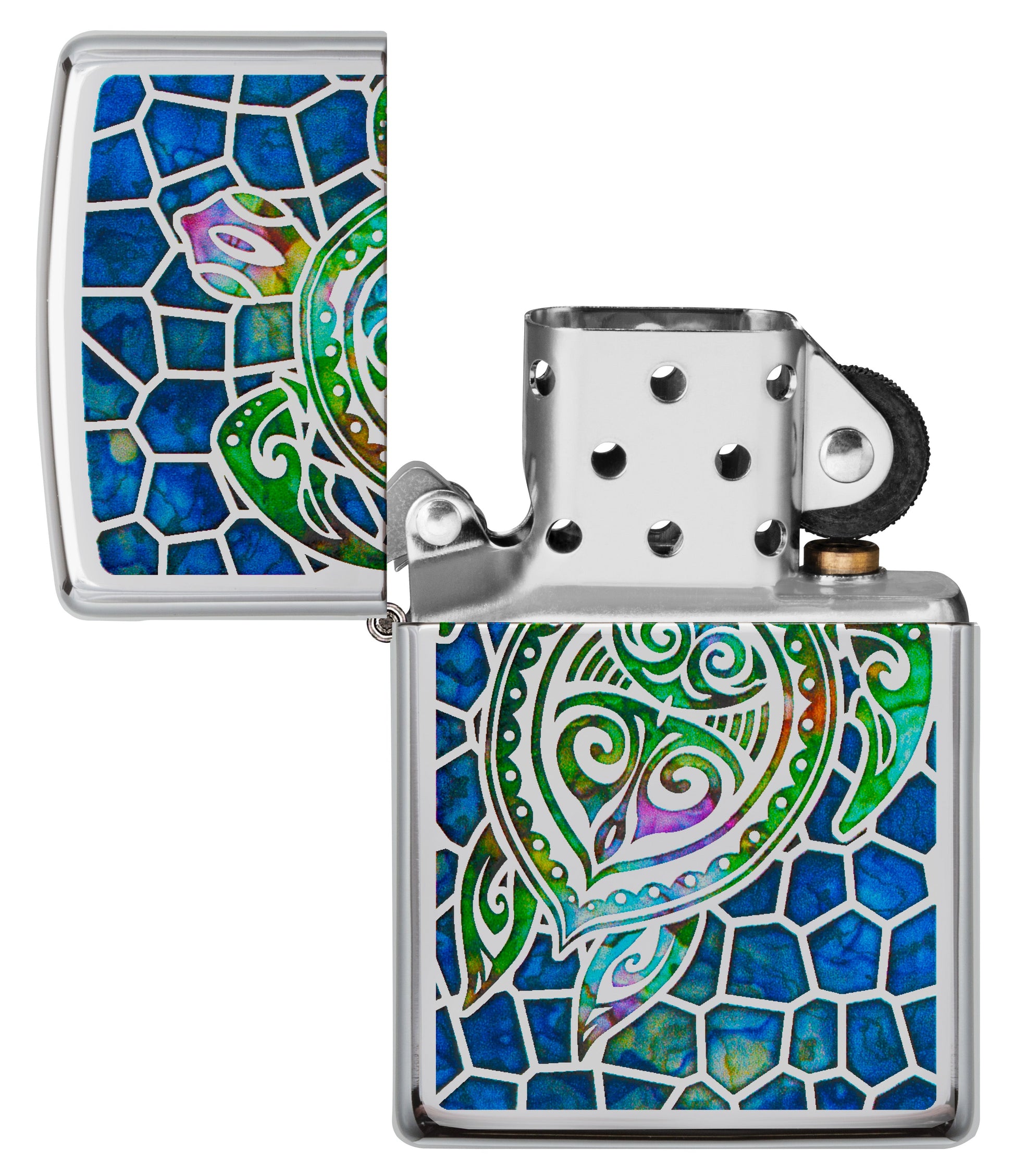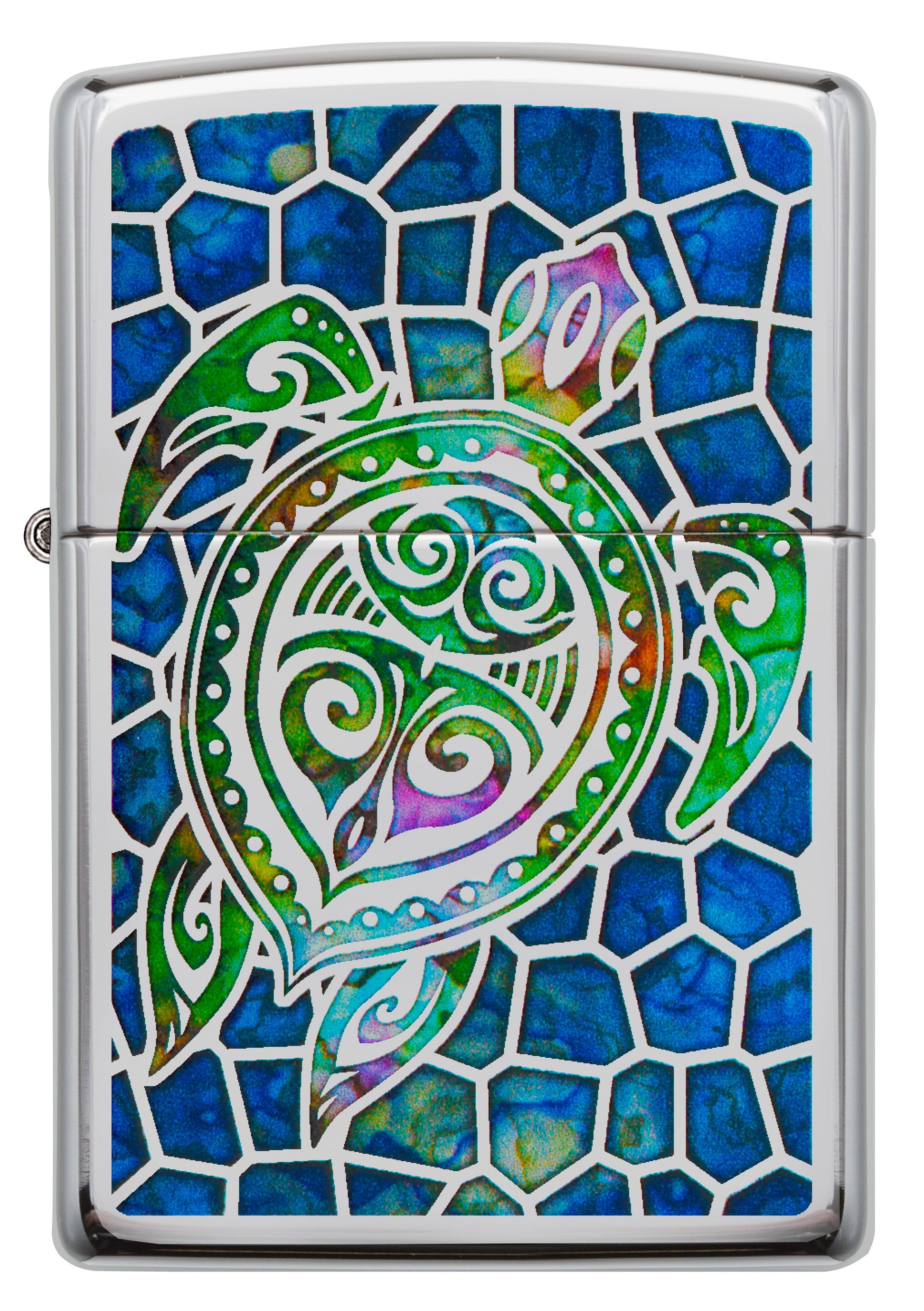 Ein atemberaubendes Schildkrötenmosaik ziert dieses klassische High Polish Chrome-Feuerzeug im schimmernden Fusion-Design.