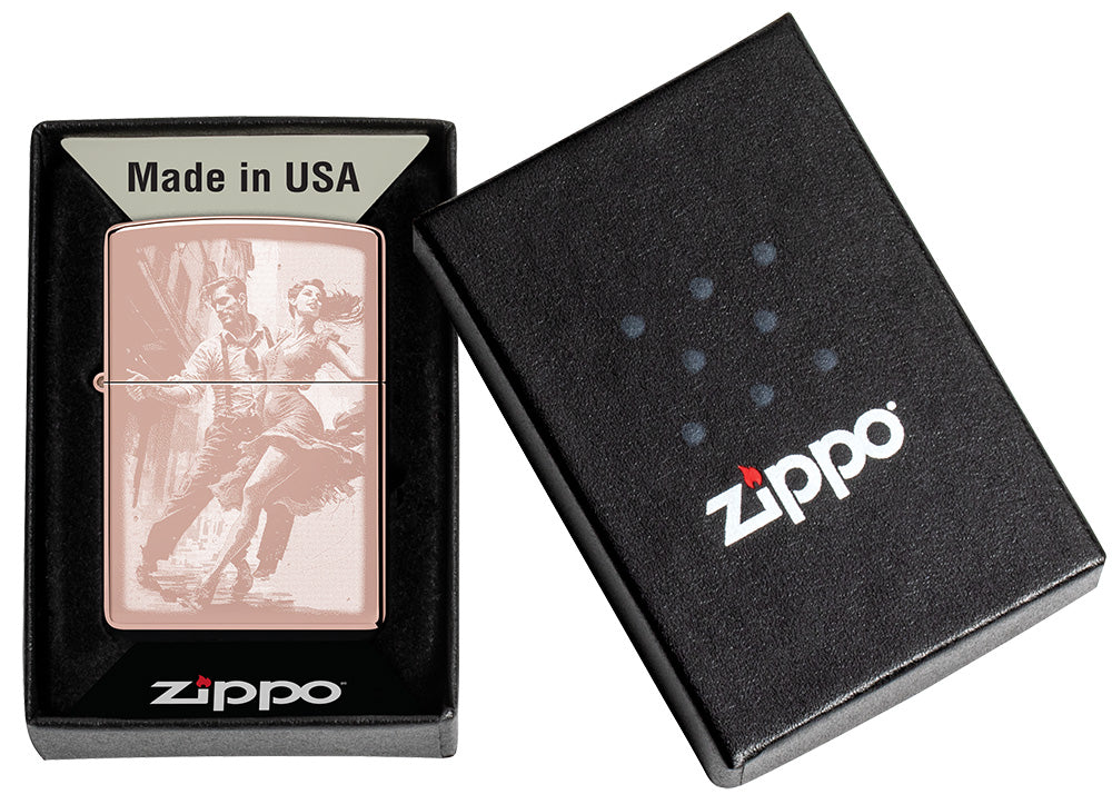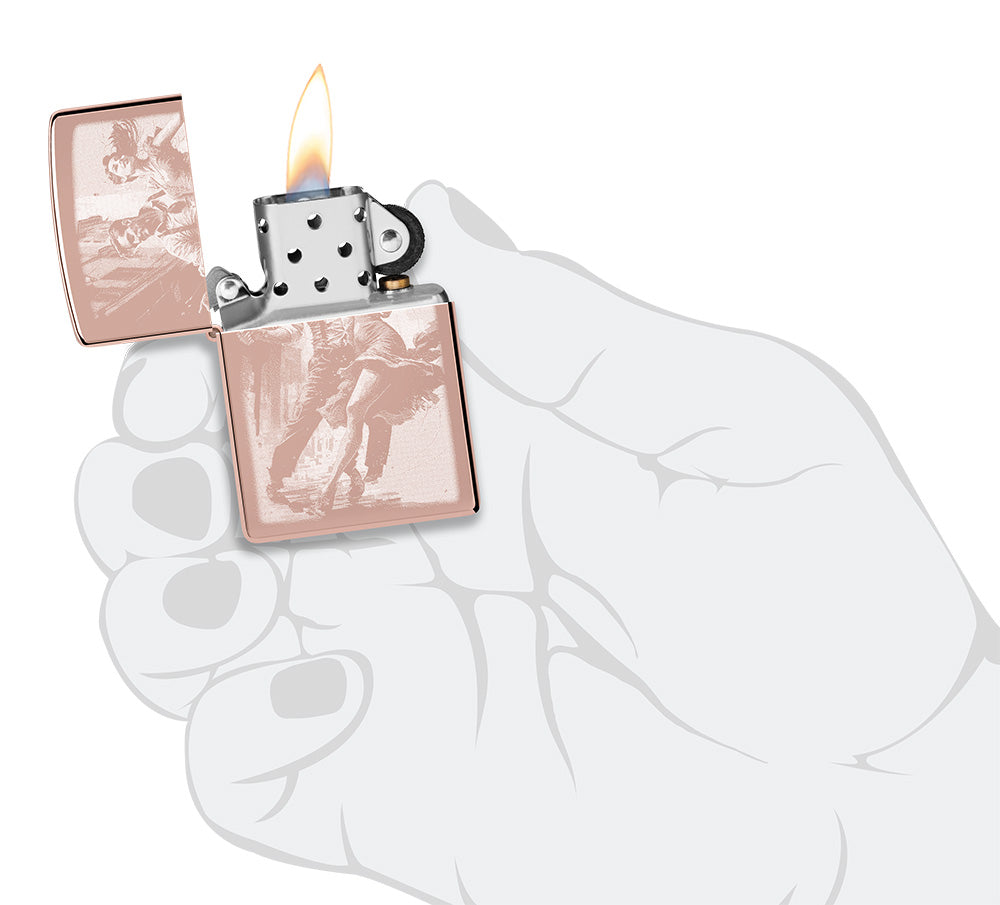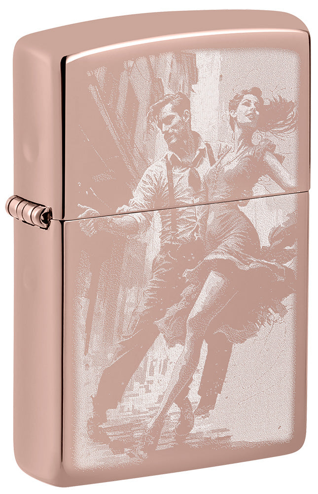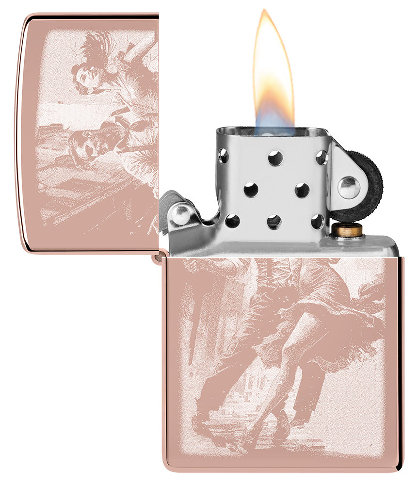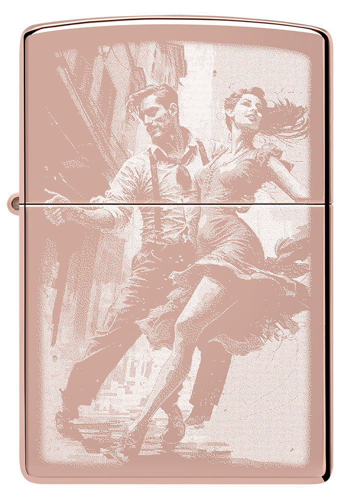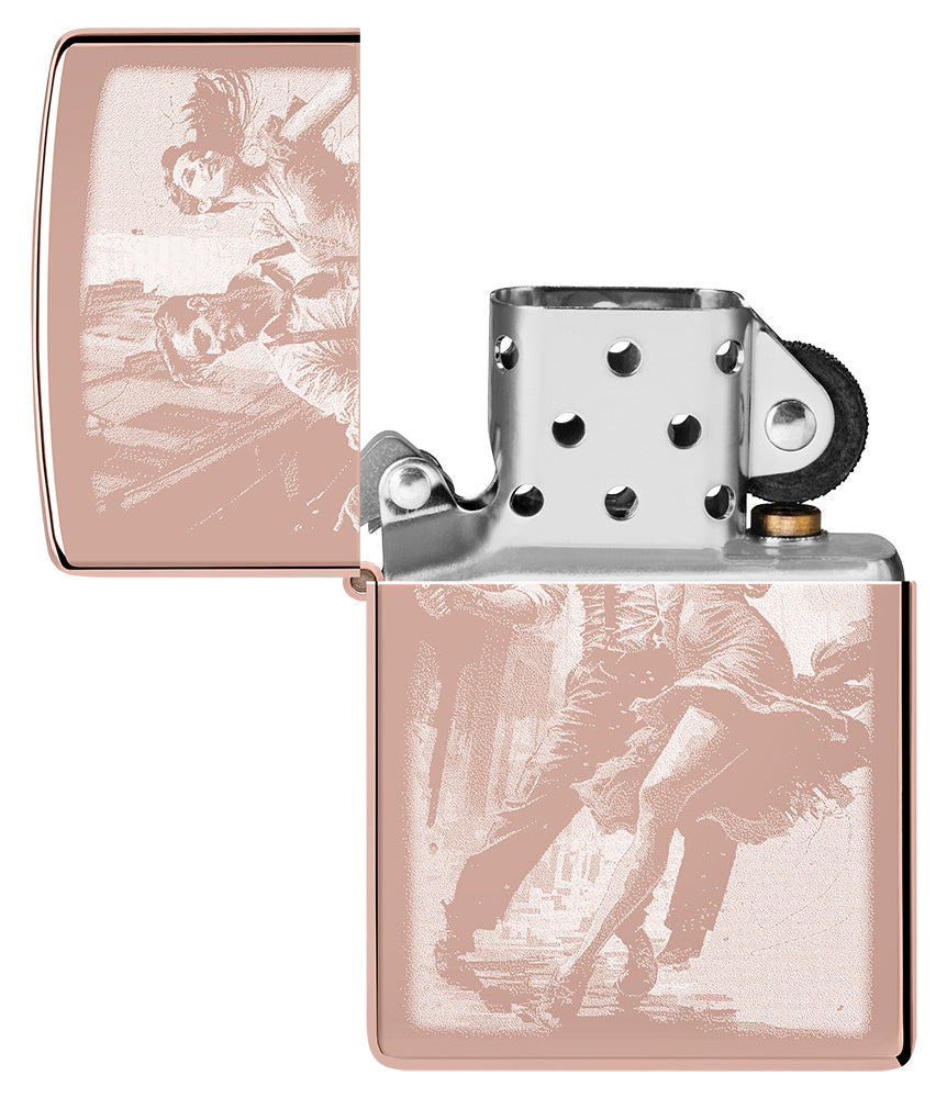 Ein Liebespaar wirbelt in einem romantischen Photo Image Design über die Oberfläche dieses klassischen Feuerzeugs in High Polish Rose Gold.