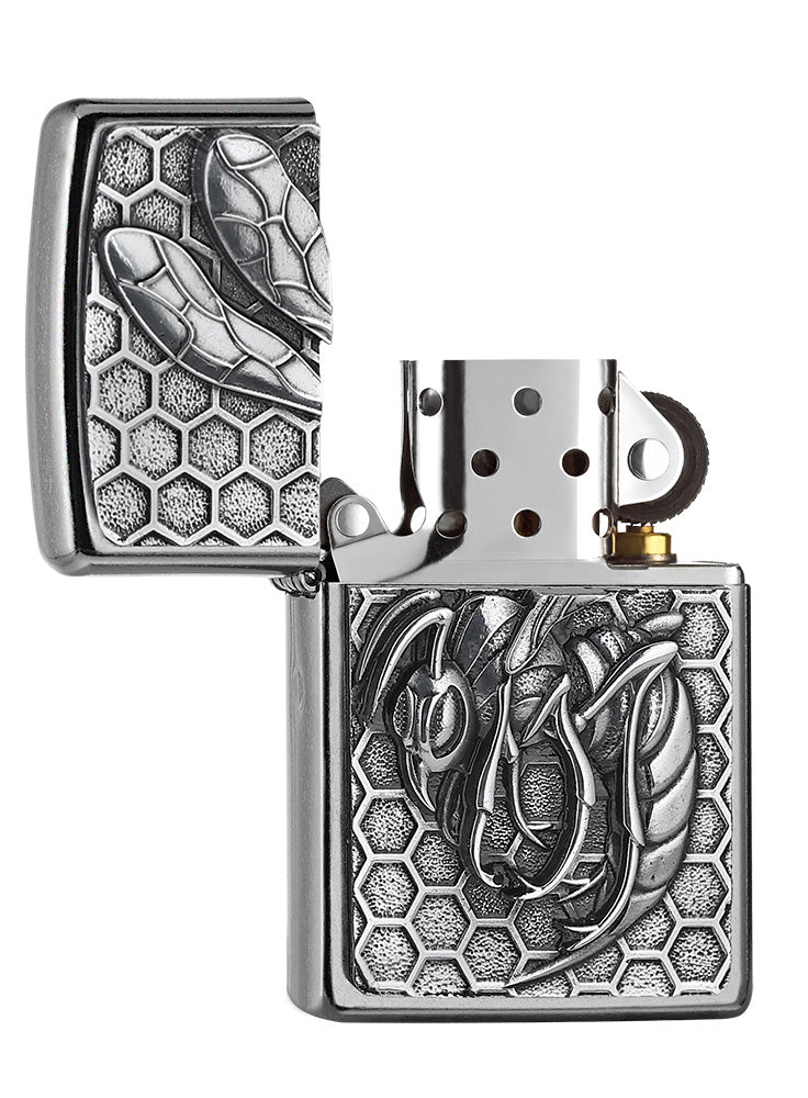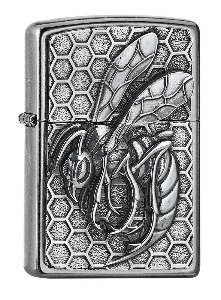 Dieses klassische Street Chrome-Feuerzeug zeigt eine grimmige Wespe auf einem wabenförmigen Hintergrund mit einem komplizierten Metallemblem.