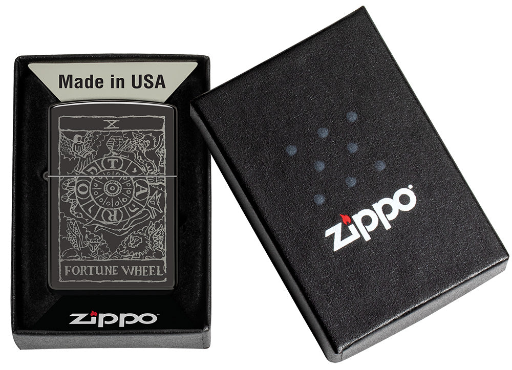 Dieses klassische Feuerzeug in High Polish Black ist mit einem geheimnisvollen Photo Image-Design versehen, das seine Inspiration in der Tarotkarte „Glücksrad“ findet.