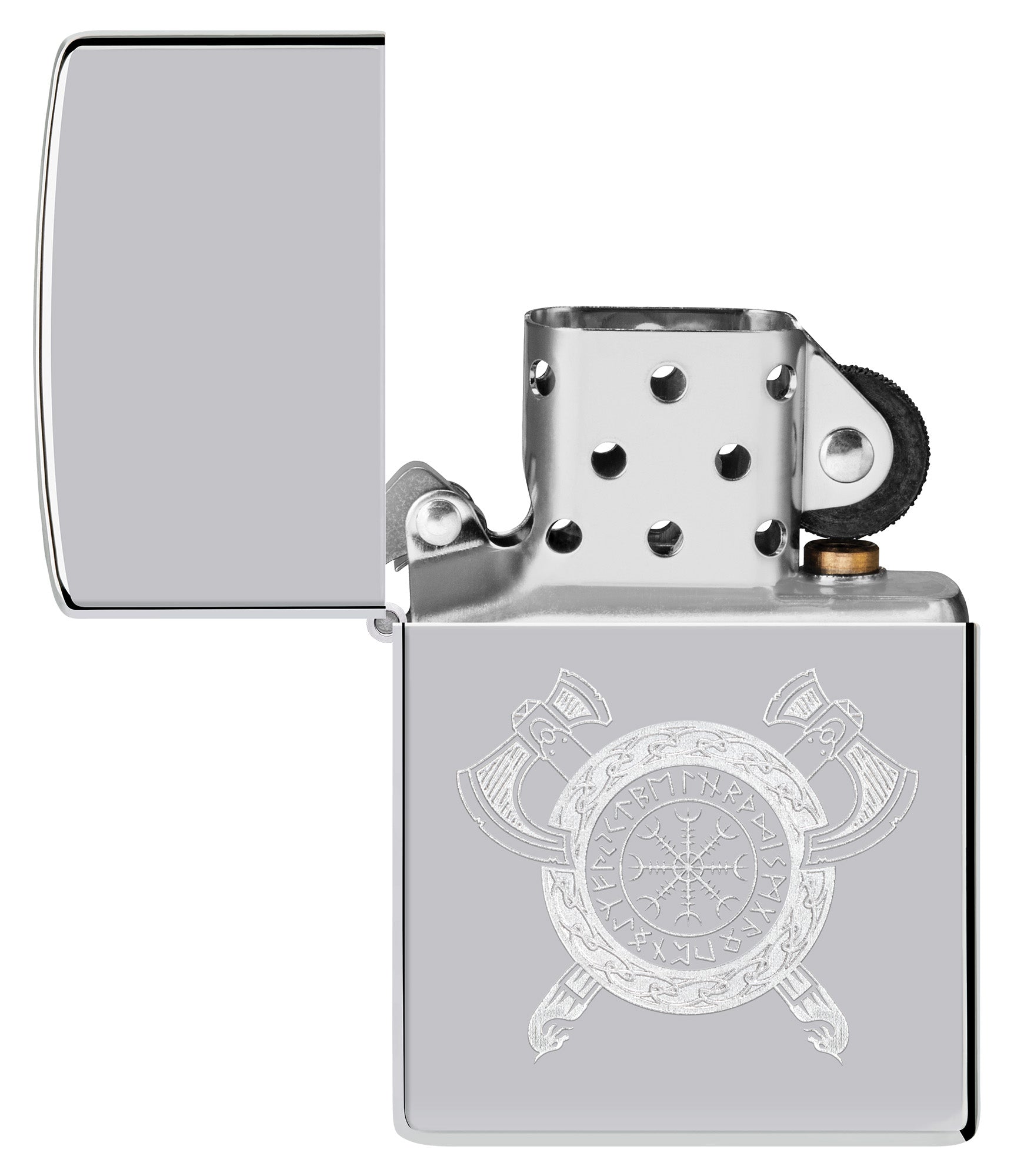 Flankiert von zwei Äxten ziert ein aufwendig gearbeiteter Wikingerschild die Oberfläche dieses klassischen Feuerzeugs in glänzendem Chrom und raffiniertem Hochglanzdesign.