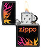 Bunte Flammen flackern um das Zippo-Logo auf diesem klassischen, mattschwarzen Feuerzeug in einem feurigen Color Image Design.
