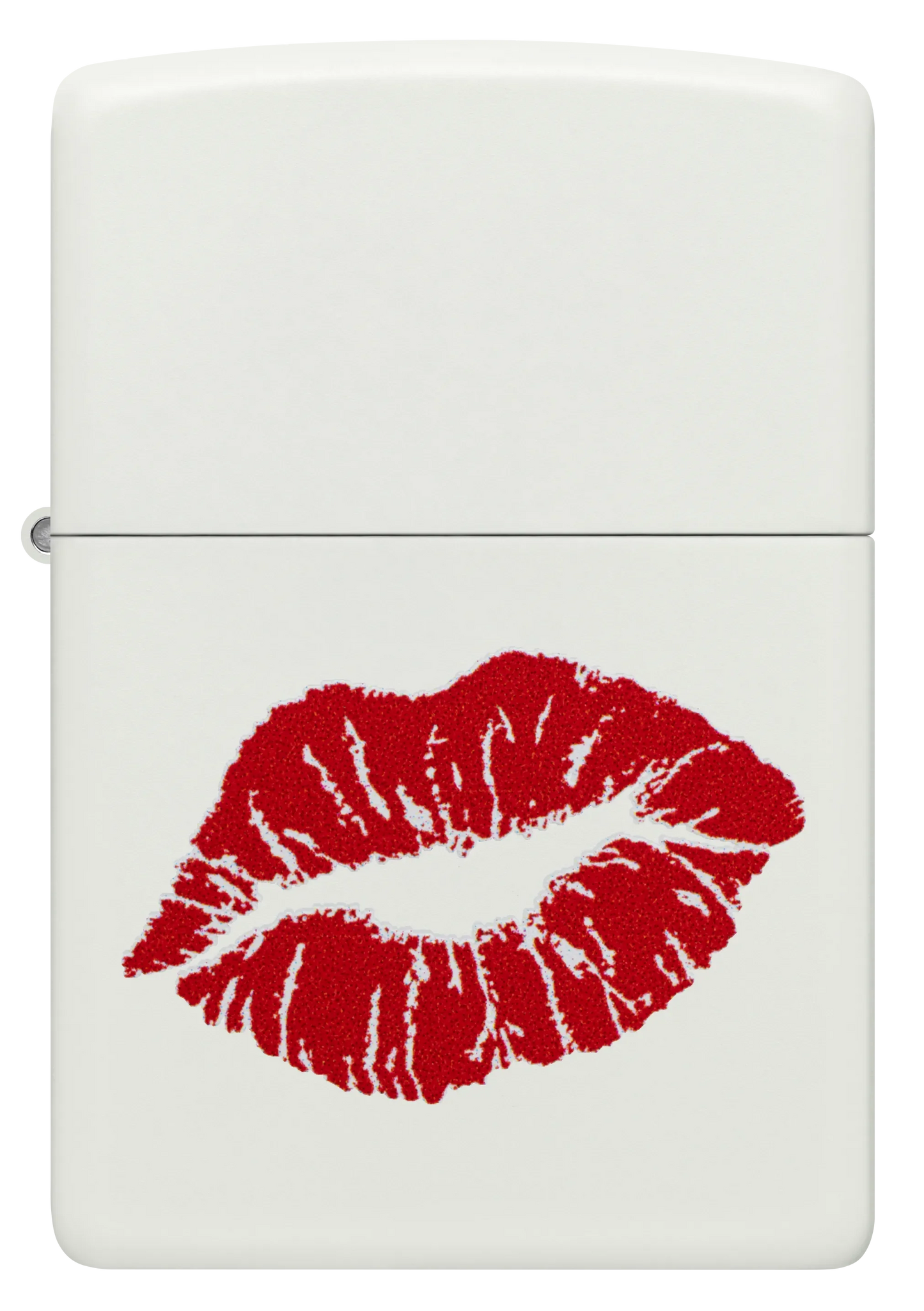 Dieses klassische White Matte-Feuerzeug ist mit einem Kuss versiegelt und zeigt einen leuchtend roten Lippenstiftabdruck in einem hübschen Color Image-Design.
