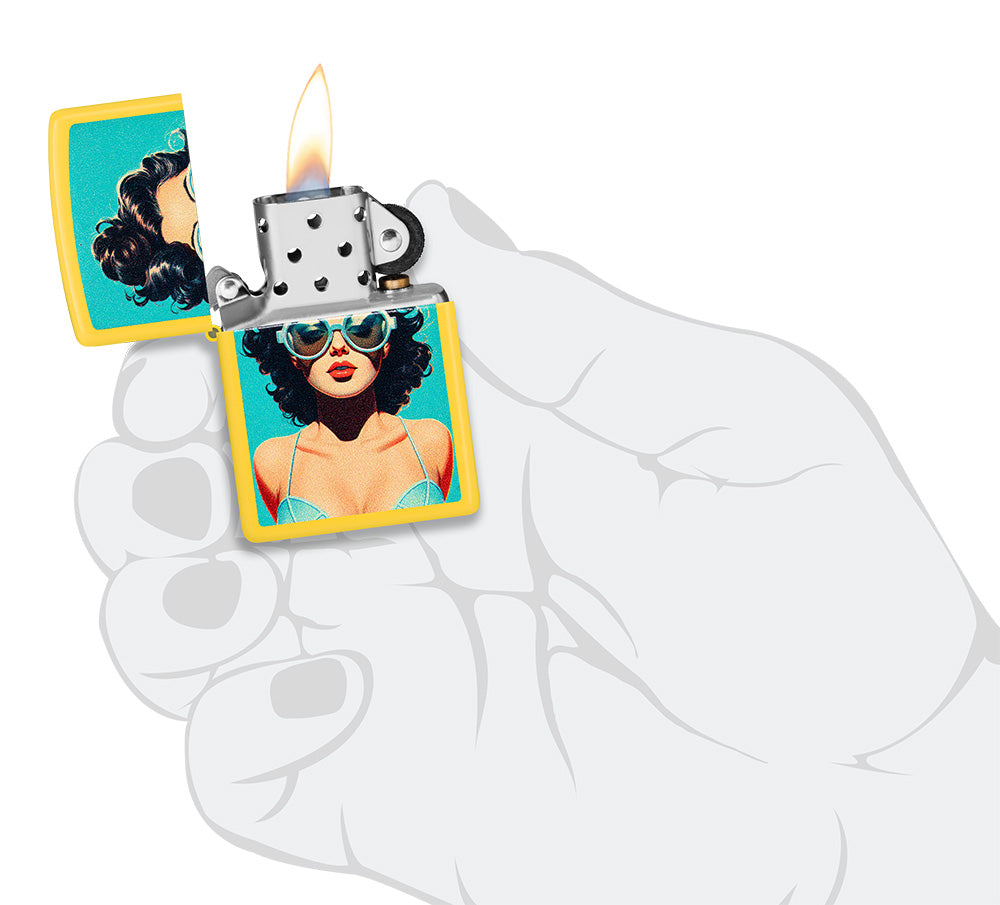 Ein glamouröses Model posiert auf der Oberfläche dieses klassischen Sunflower Feuerzeugs in einem hellen und sonnigen Color Image Design.